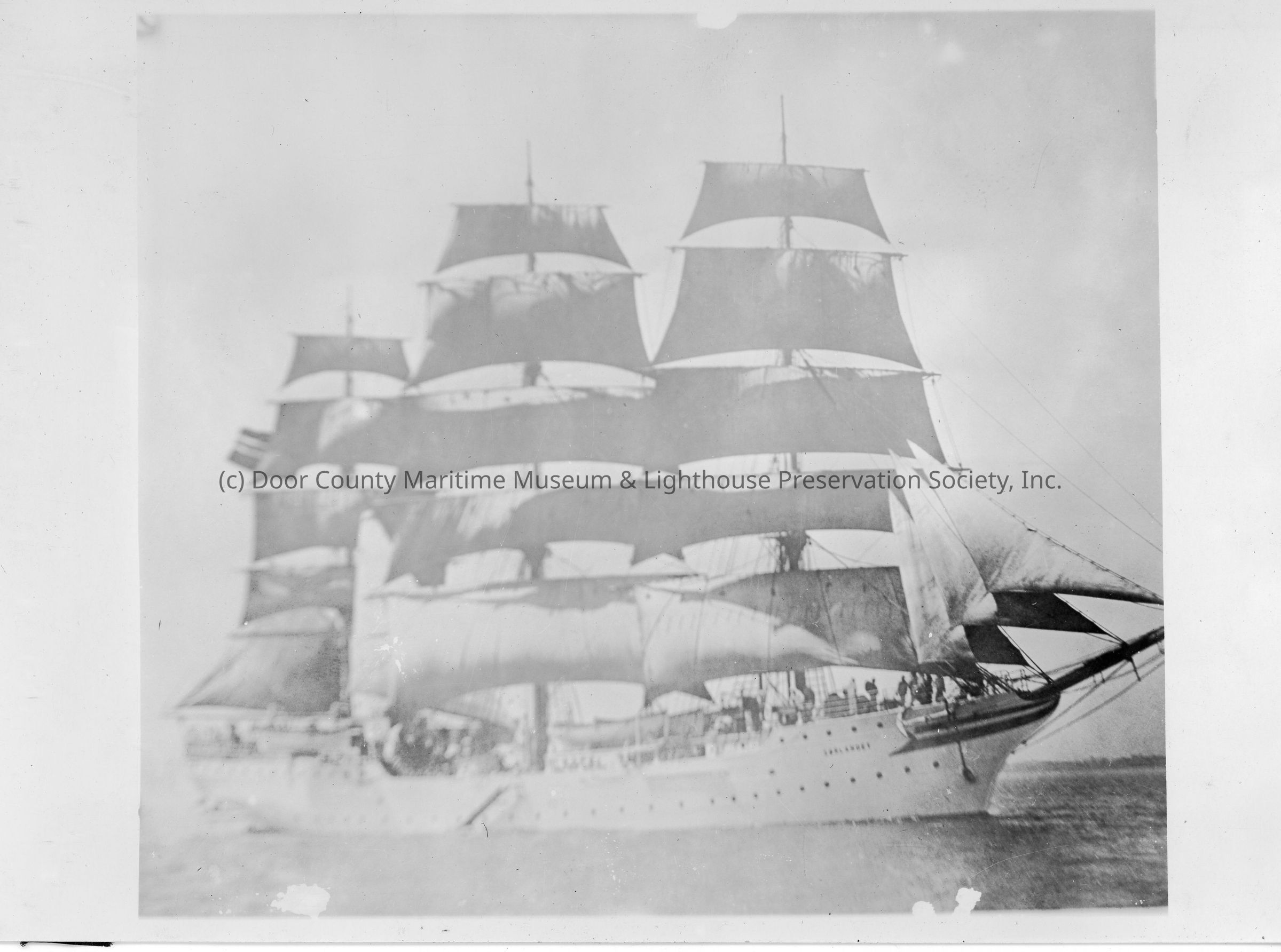 Three masted sailing vessel with people on board underway