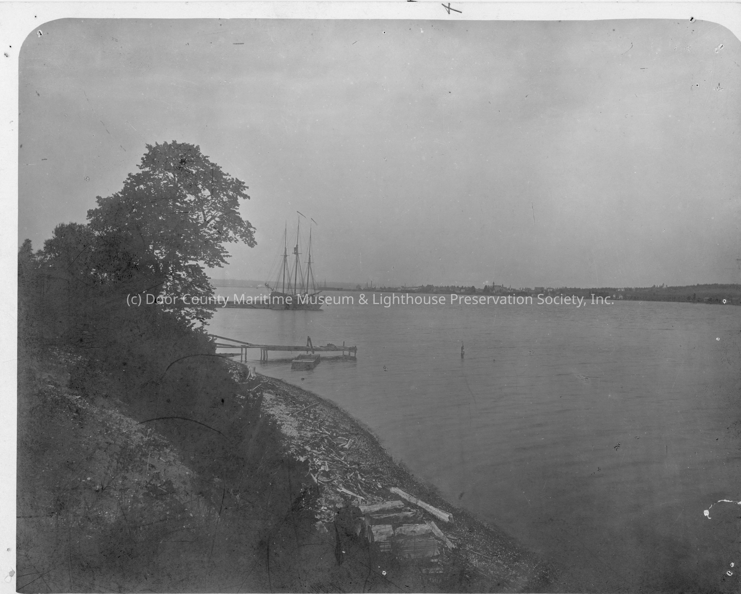 Three masted vessel at pier left shoreline