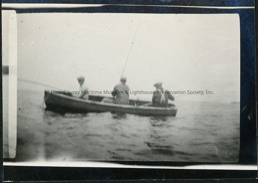 Three men in a rowboat fishing. Album identifies them as Lewis Anderson from the farm, fishing. 1924Location