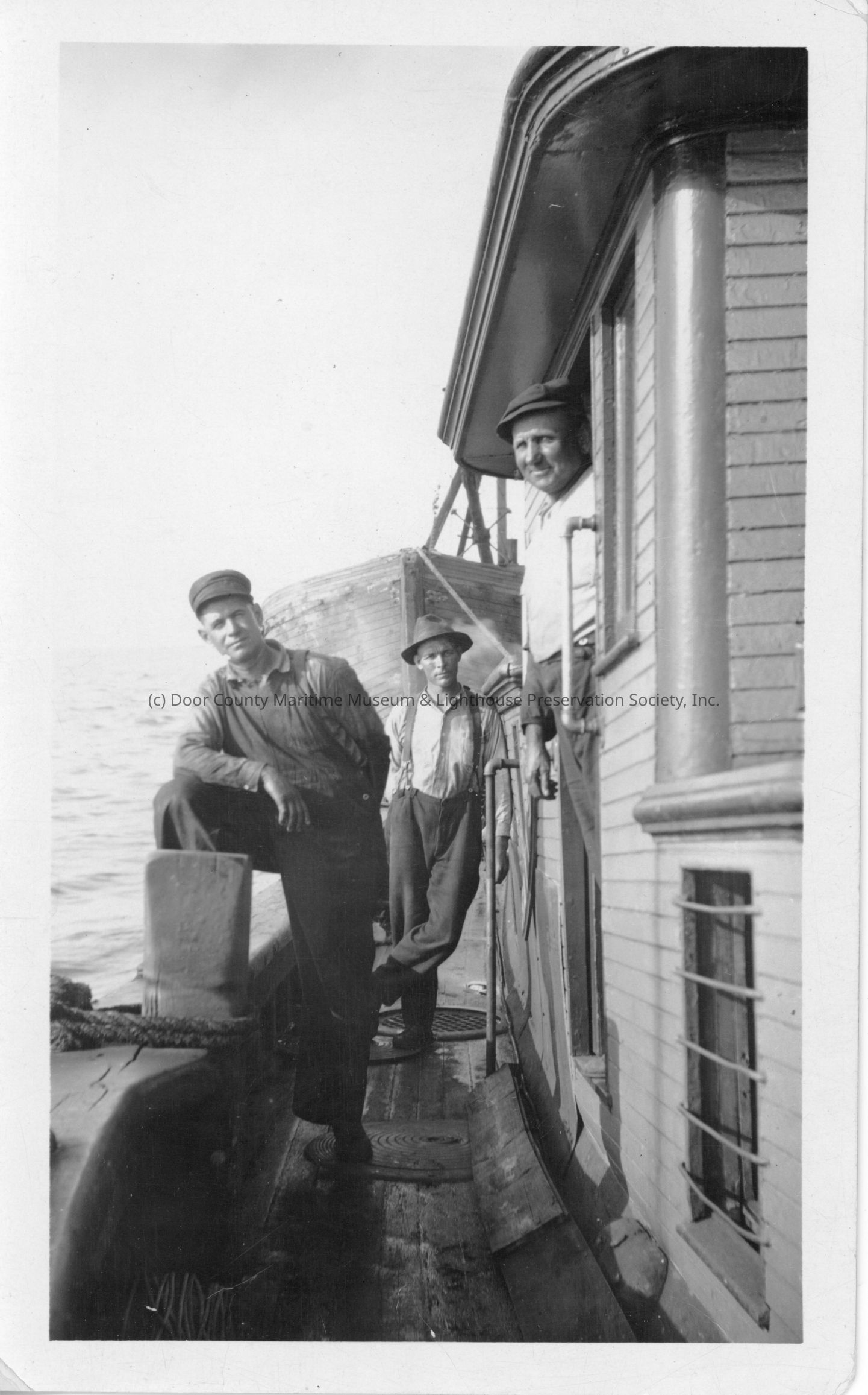 Three men on deck of vessel towing vessel