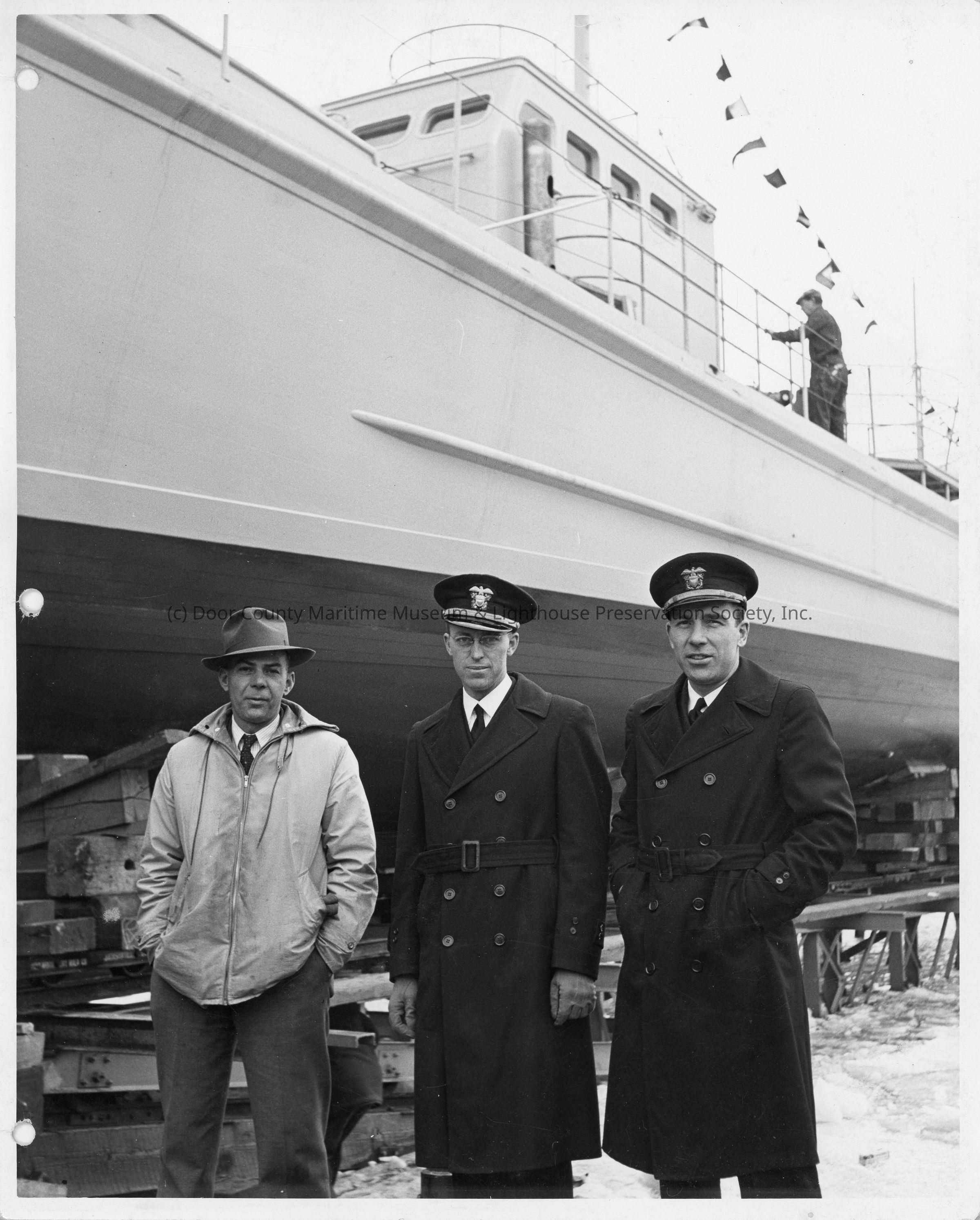 Three men standing in front of PC-536 with man on deck March 5, 1942