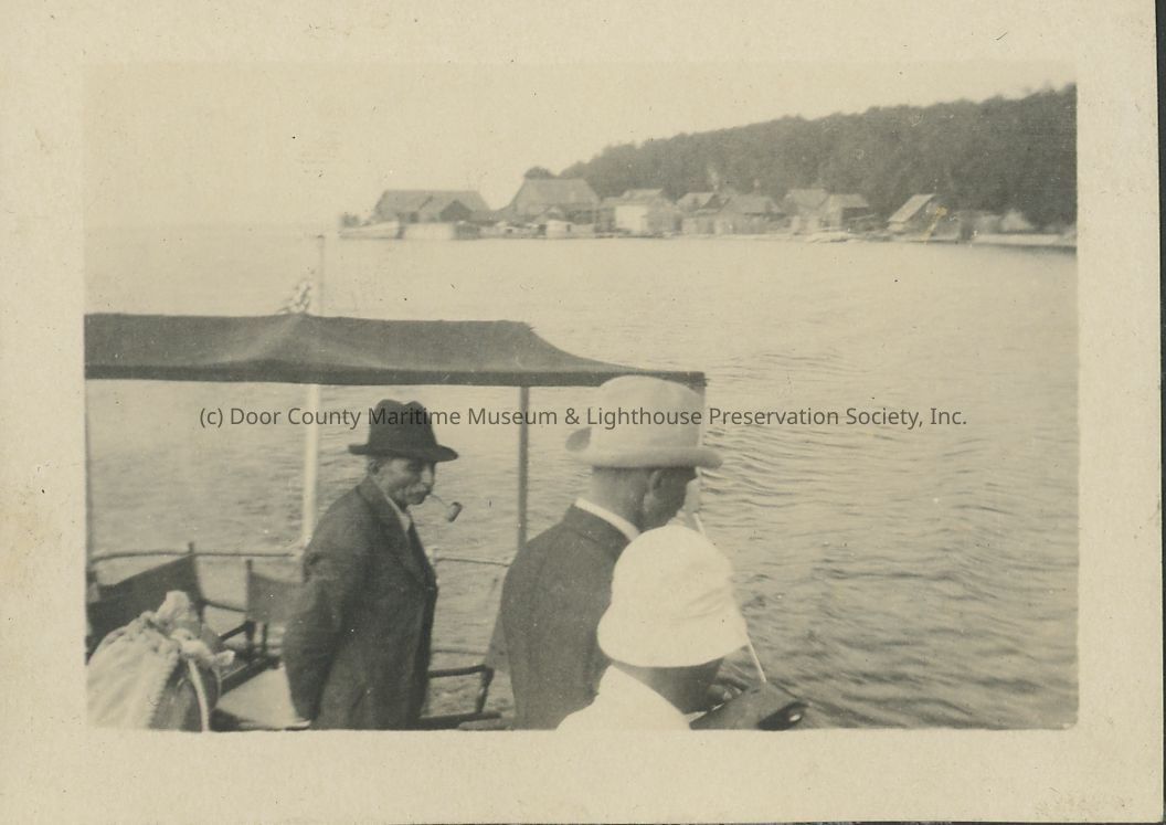 Three unidentified men, wearing suits, stand in excursion-type vessel. One man smokes a pipe. Commercial buildings, fishtug visible on shoreline in background.Location
