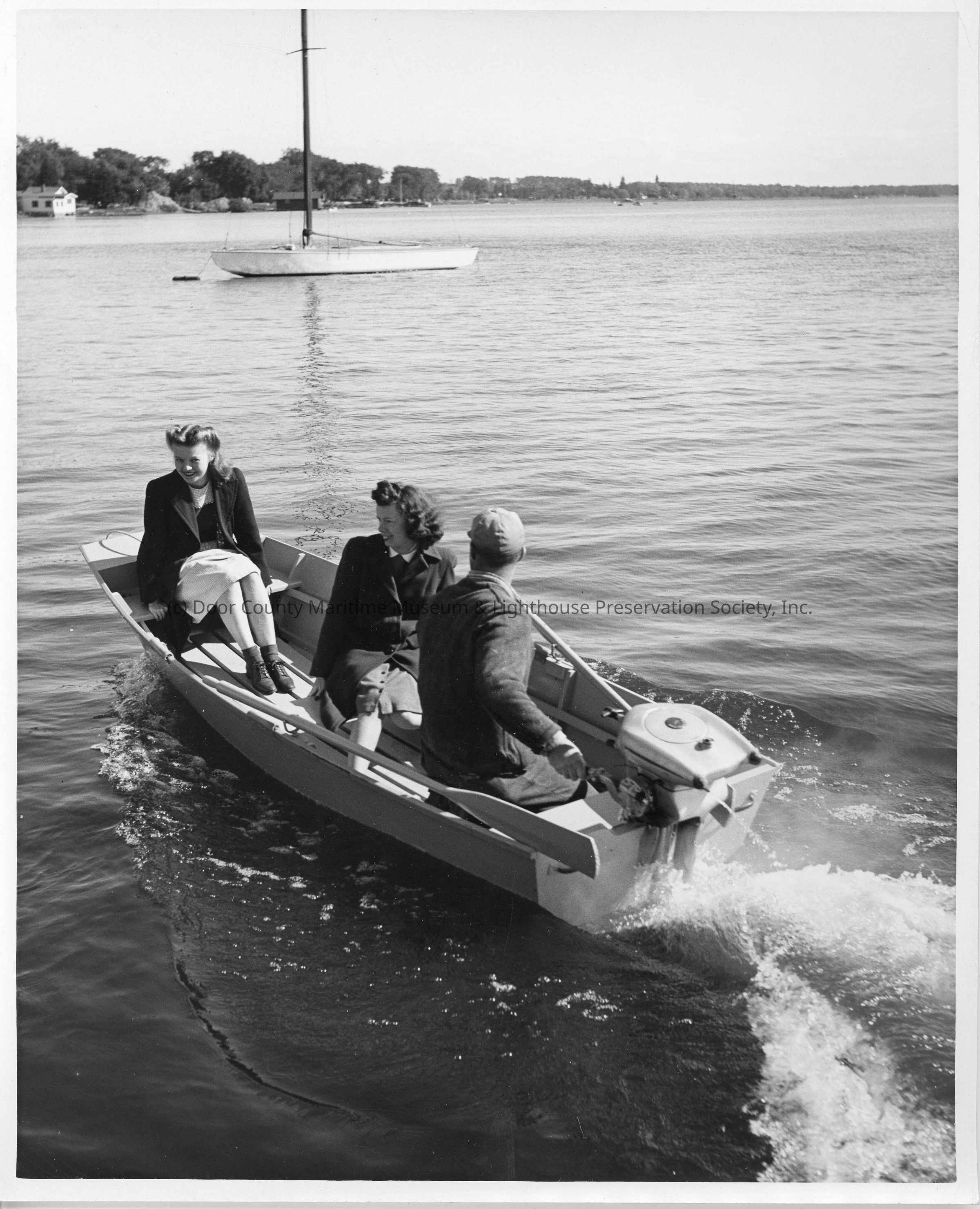 Three people in blunt nose rowboat with outboard motor underway October 11, 1944
