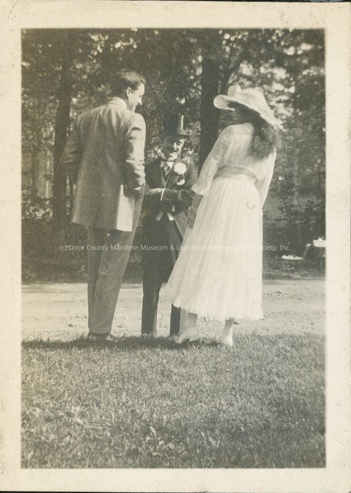 Two well dressed men and a woman in a white dress in a yard smiling and talking. The man in the middle is dressed formally, in a top hat, tails and a flower in his lapel.Location