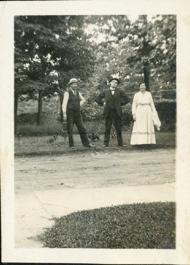 Two unidentified men and a woman pose for photo along path or road.