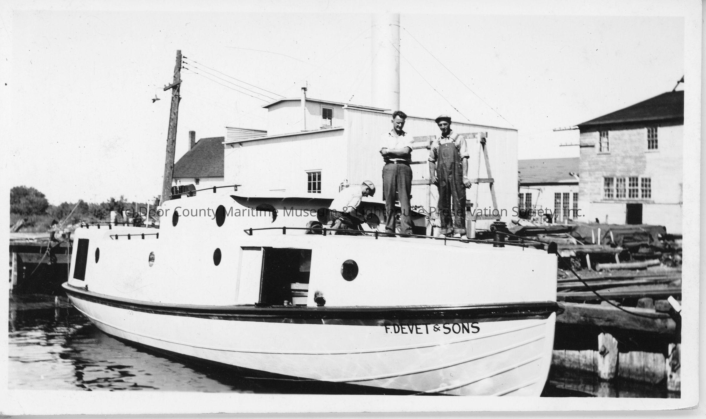 Three people standing on bow of fishing tug F. Devet and Sons