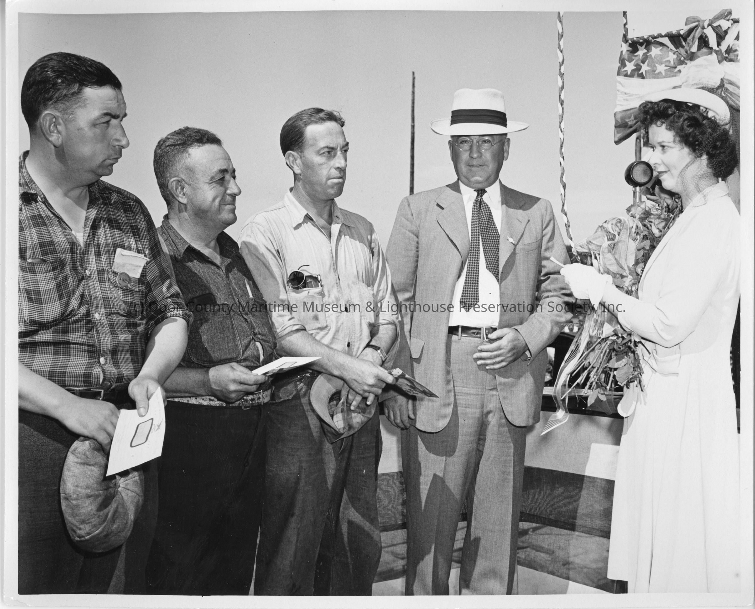Three unidentified male employees in work clothes standing next to LD Smith and ship sponsorEntry/Object ID