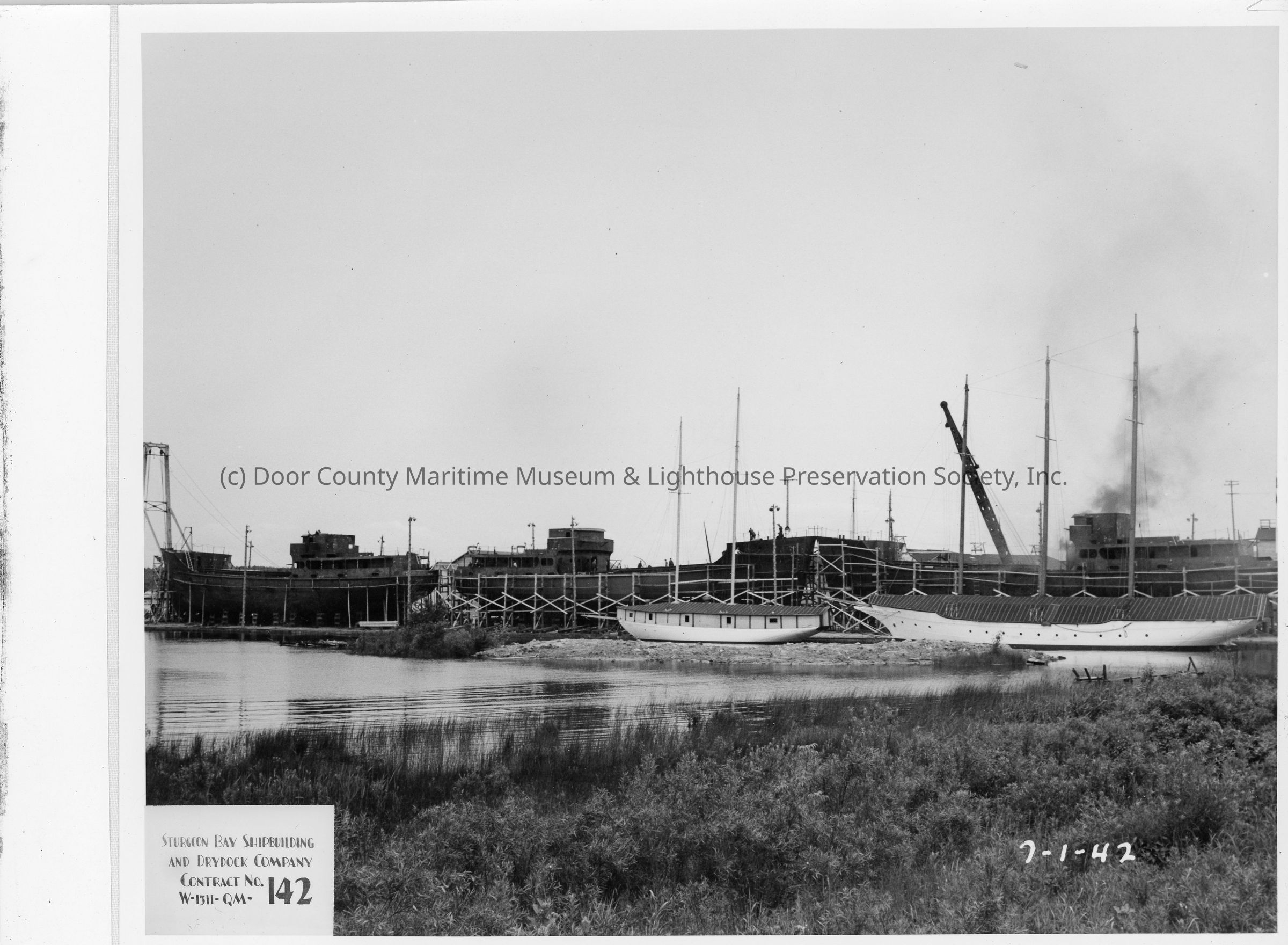 Three vessels in scaffolding at Sturgeon Bay Shipbuilding and Drydock Company July 1, 1942Entry/Object ID