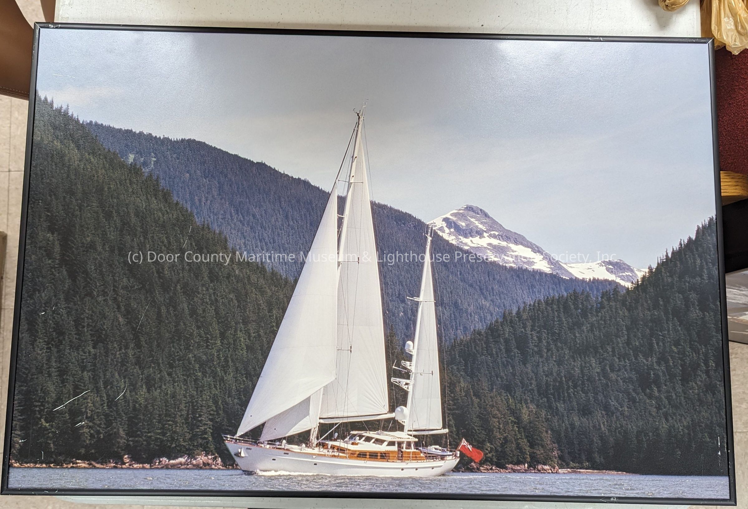 Large print of sailing yacht Timoneer sailing besides a pine tree covered mountain with a bare, snowy, mountain in the background. Vessel is flying a Union Jack in the upper left hand corner on a red field.Location