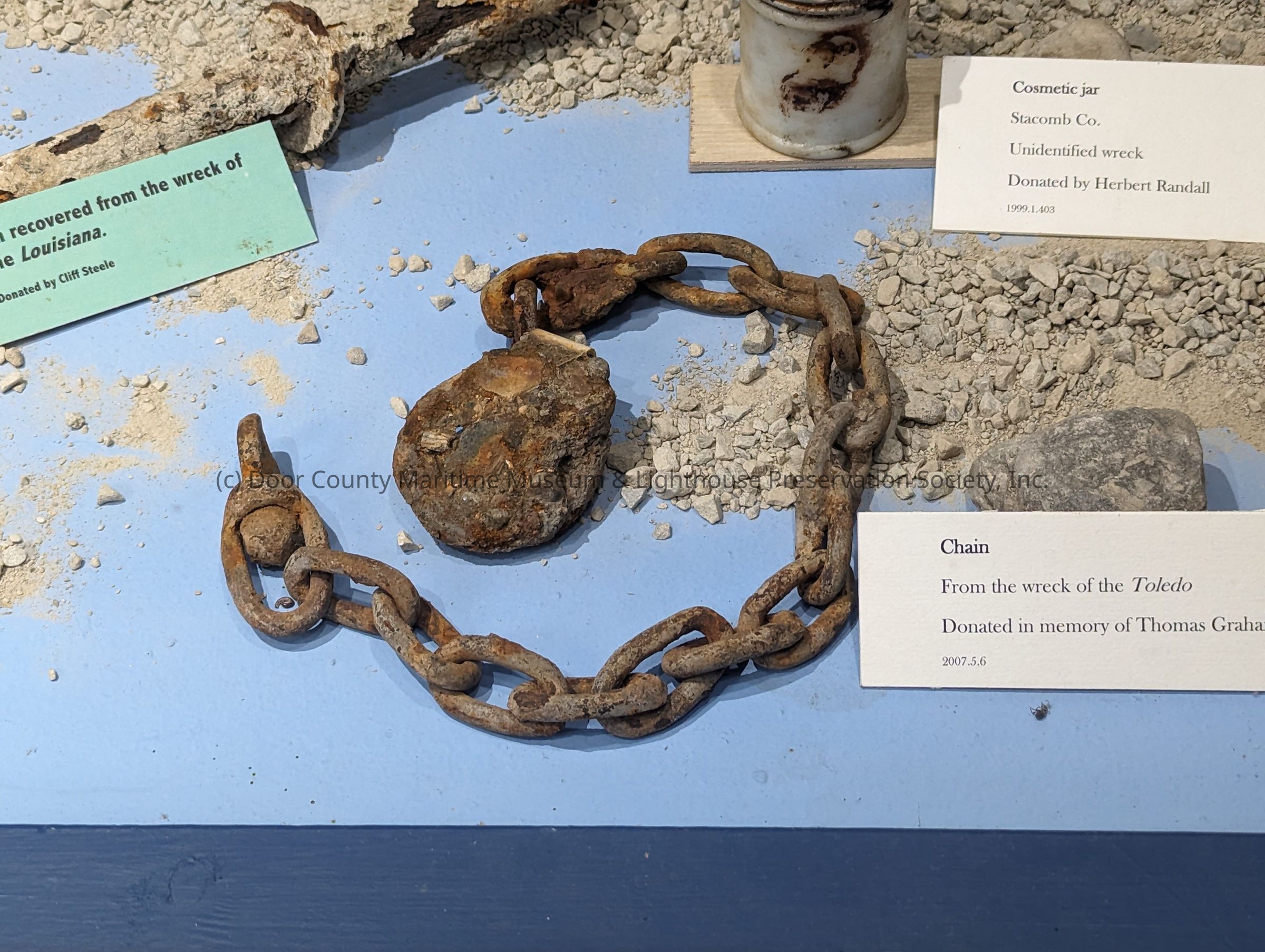Rusted metal chain with 14 links and a heavily rusted padlock