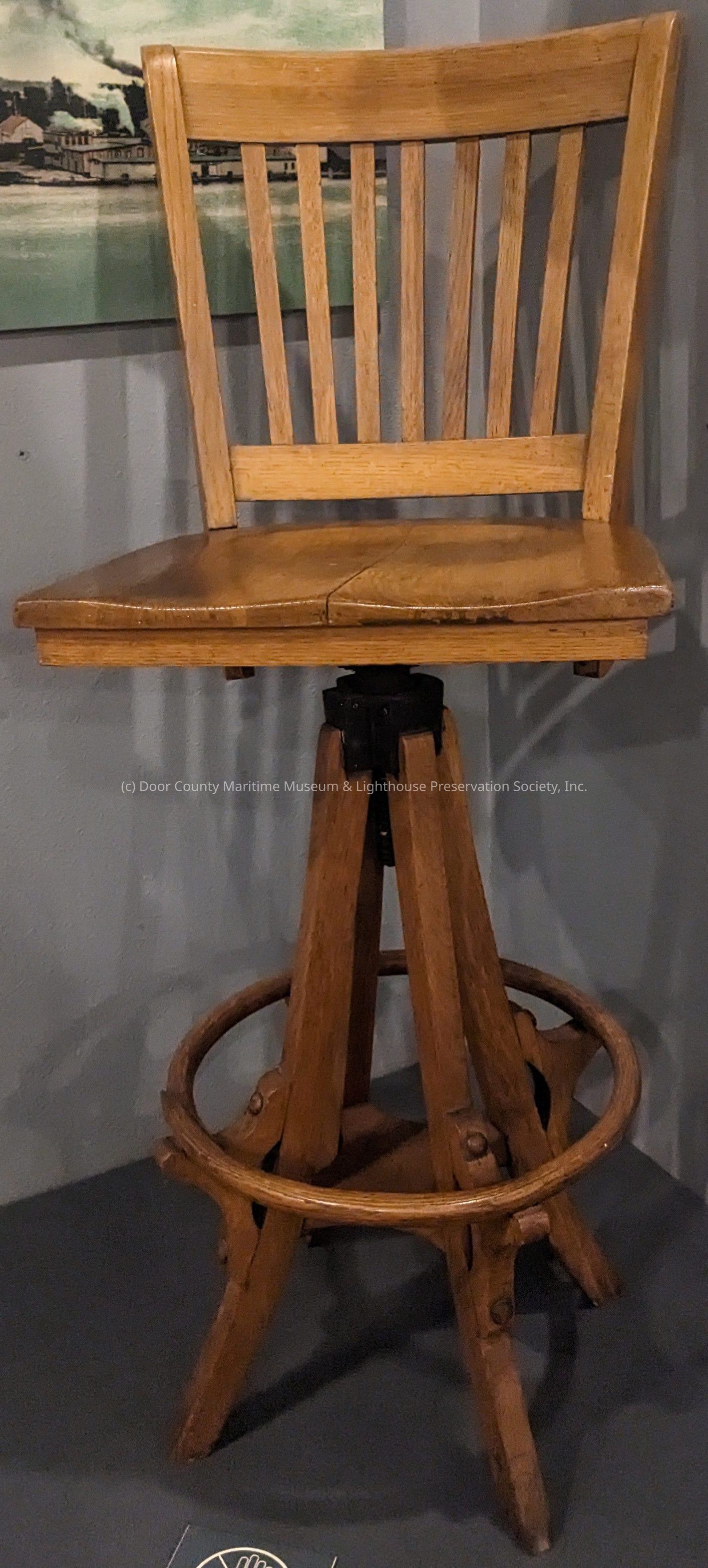 Toll taker's chair from Leathem & Smith bridge in Sturgeon Bay, WI; slatted back; varnished oak; swivel seat; black metal "adjuster" beneath seat; four legs; circular piece on brackets toward the bottom of legs; refinished by Walter Sterling.Location