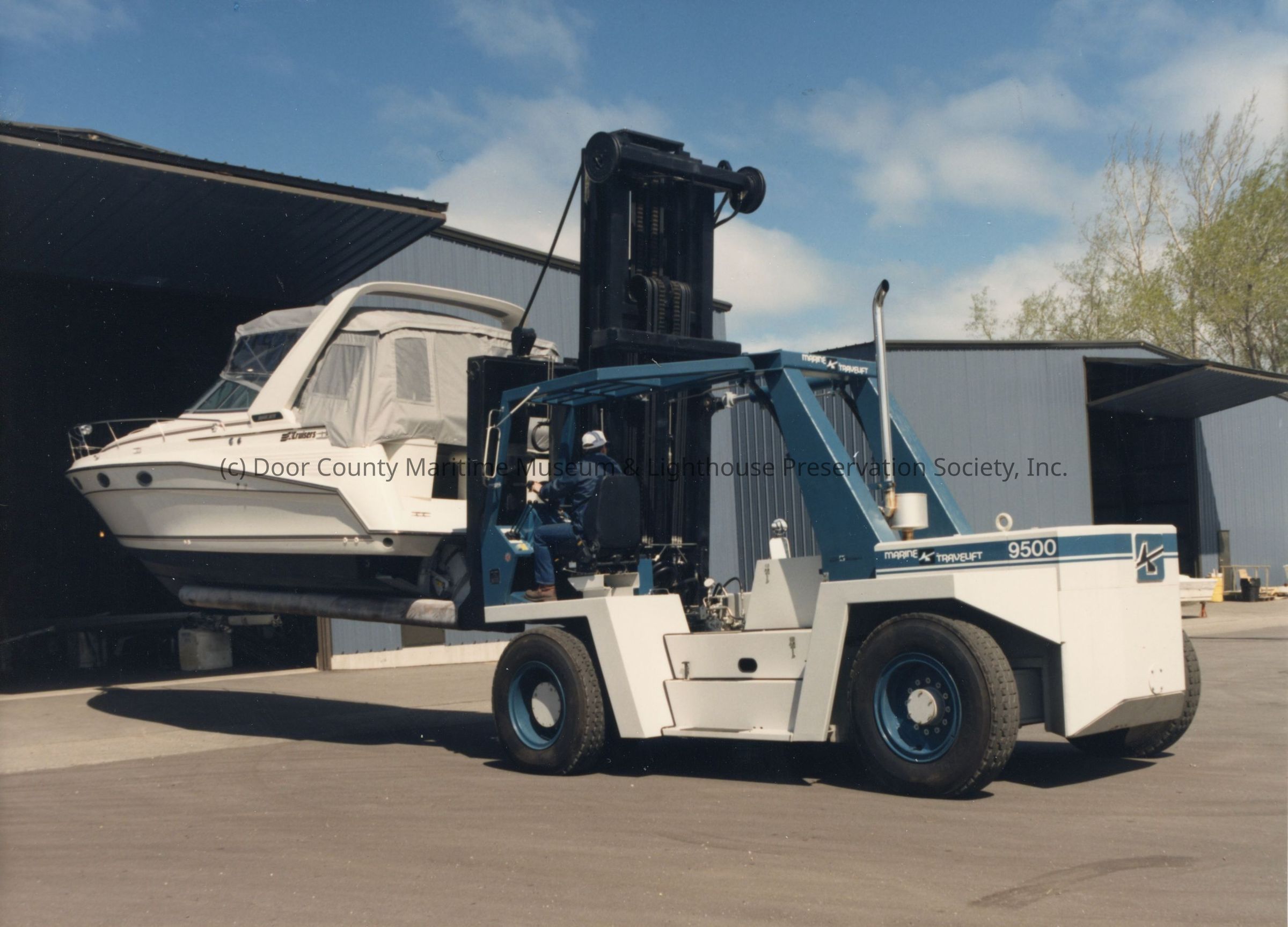 Travelift forklift holding yacht