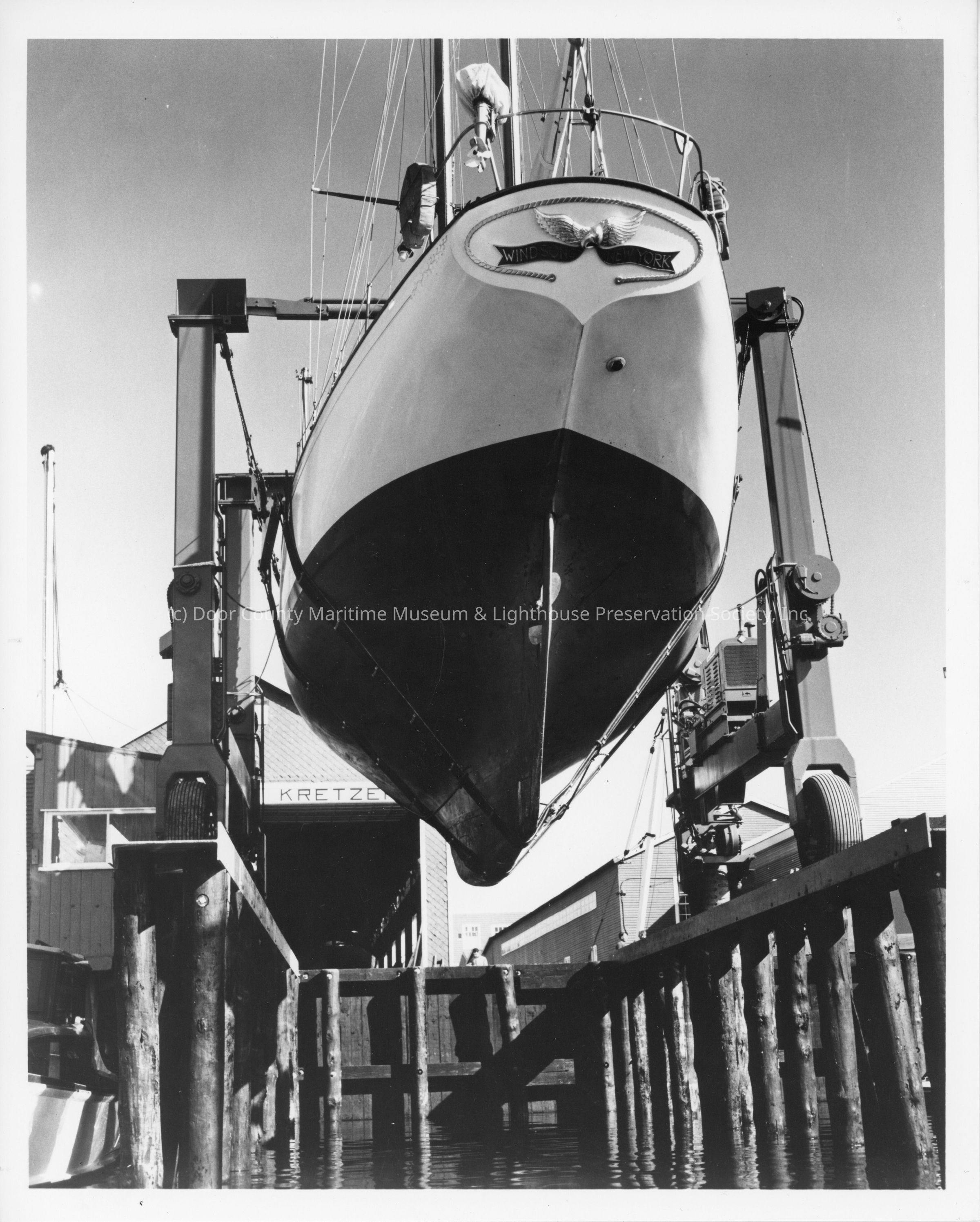 Travelift holding sailboat Windsong over dock