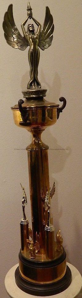 Mostly gold metal; inscribed "Southwestern Motor Sales; trophy, 1952; International Tug Boat Race; 1st tug across finish line; presented by Floyd S. Ostrom, Pres;" cylindrical base with smaller cylinder above with angel on top; three smaller stands on lower base with angel on each; three eagles.Location