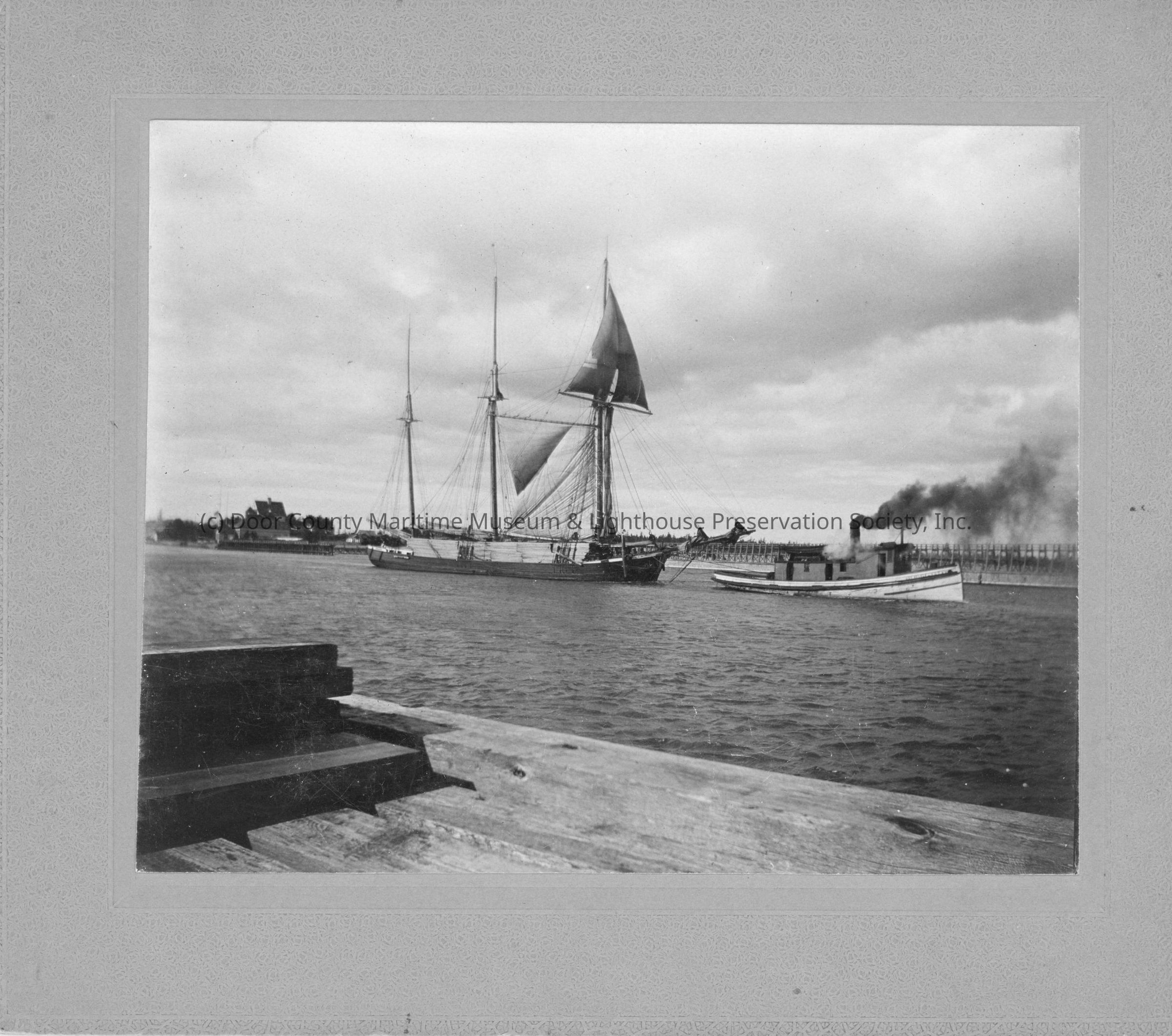 Tug towing tall ship with 3 sails through channel