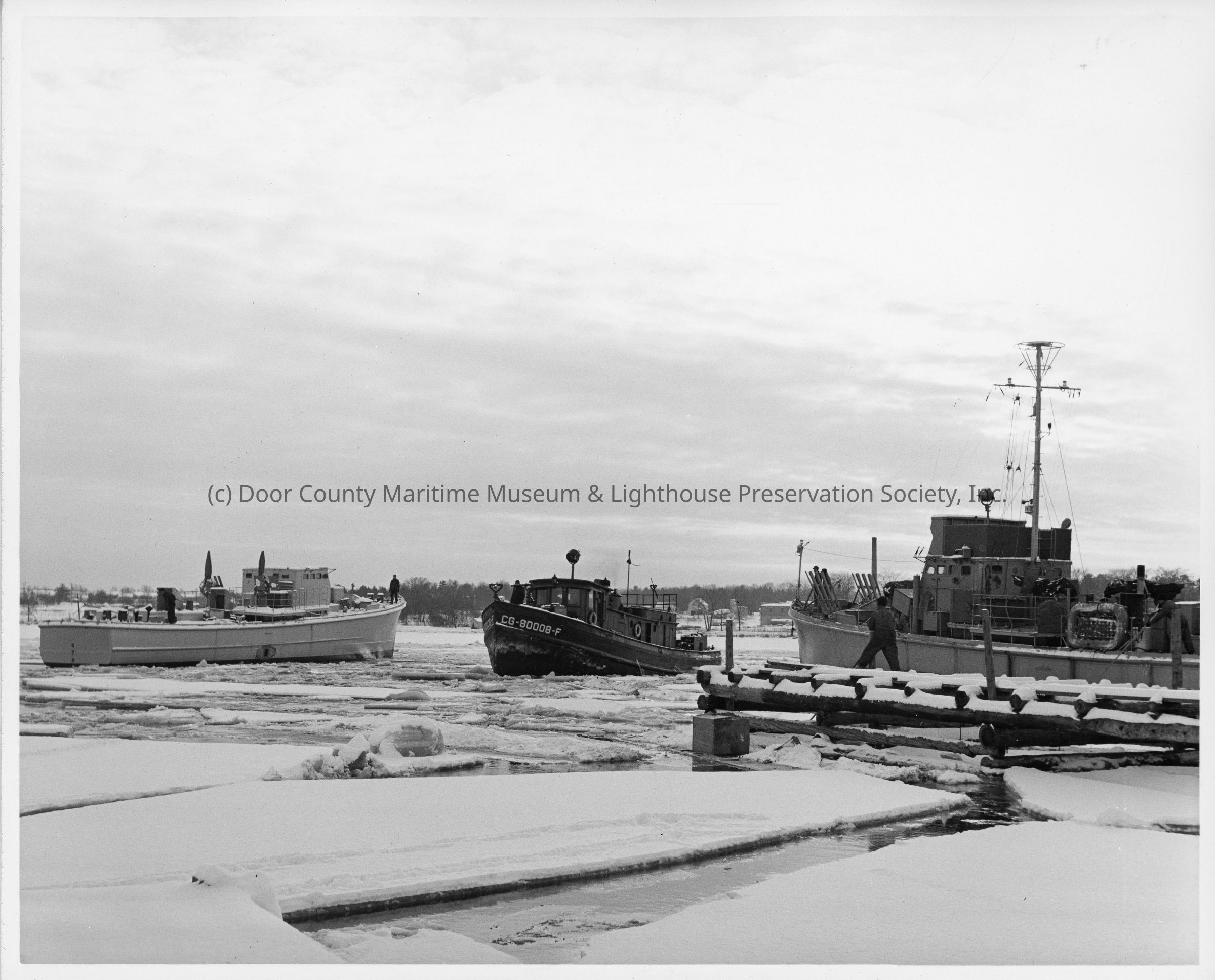 Tugboat between two subchasers at Peterson Boat Works in winter