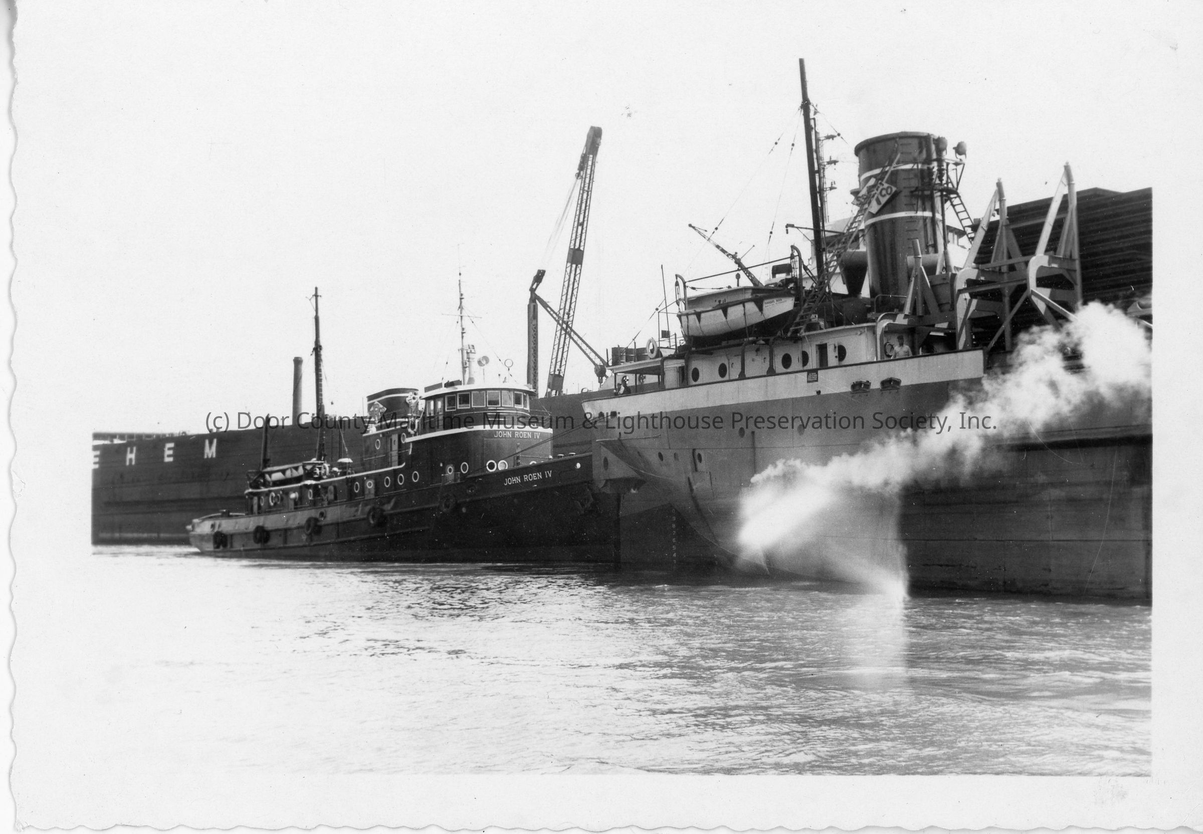 Tugboat John Roen IV next to stern of freighter