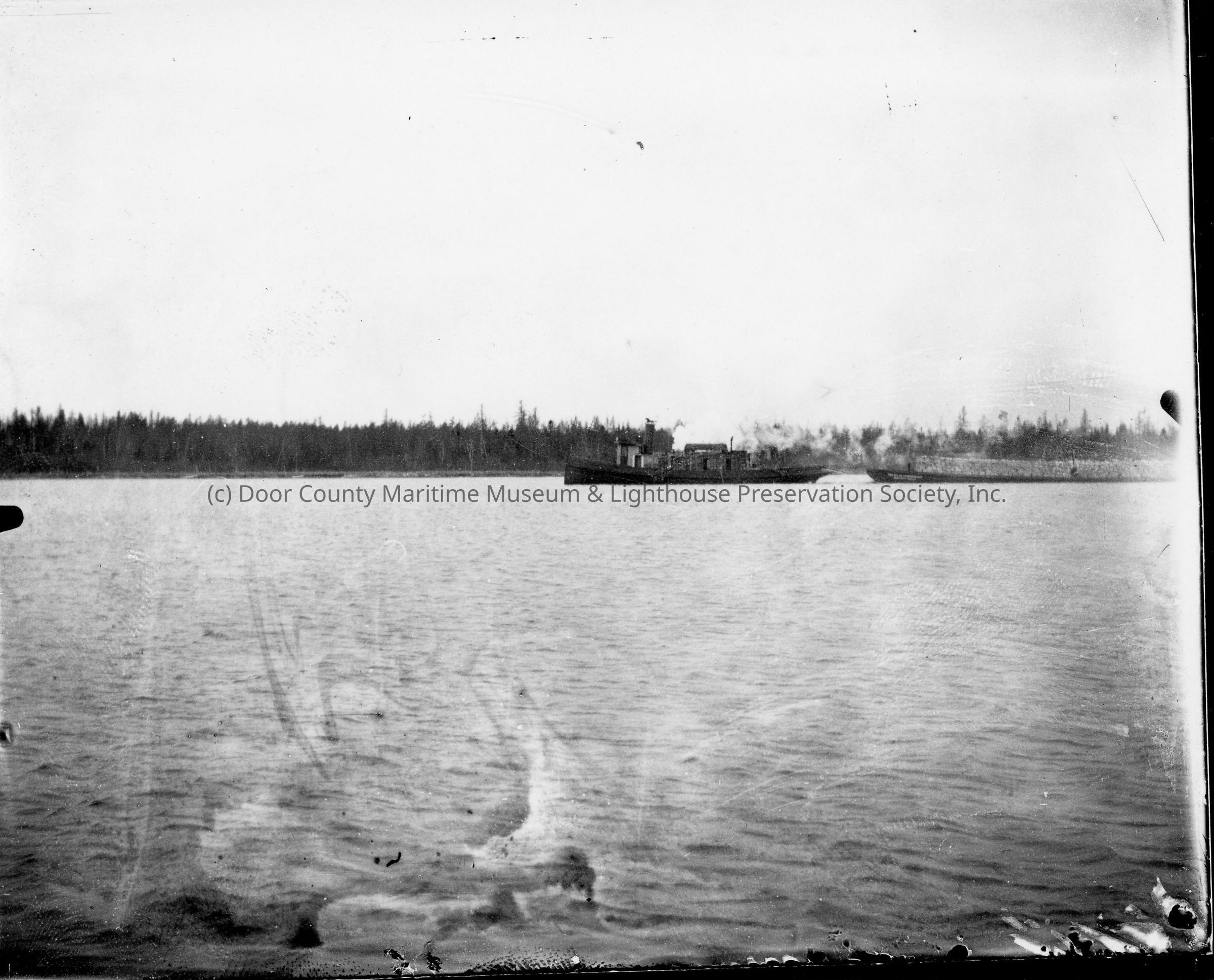 Tugboat towing barge loaded with lumber in Bay of Sturgeon Bay April, 1961