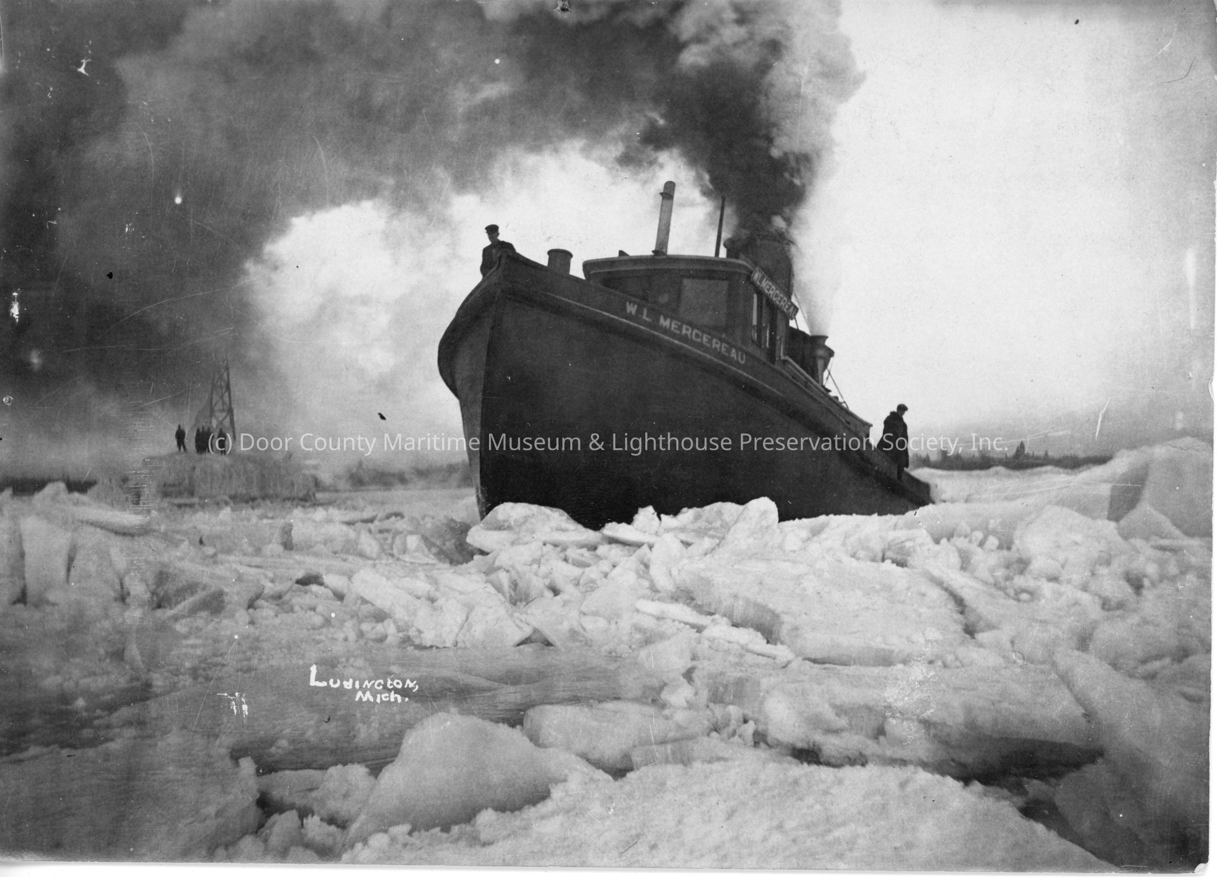 depicts the tug "Mercereau" breaking the ice jam at Ludington, MichiganLocation