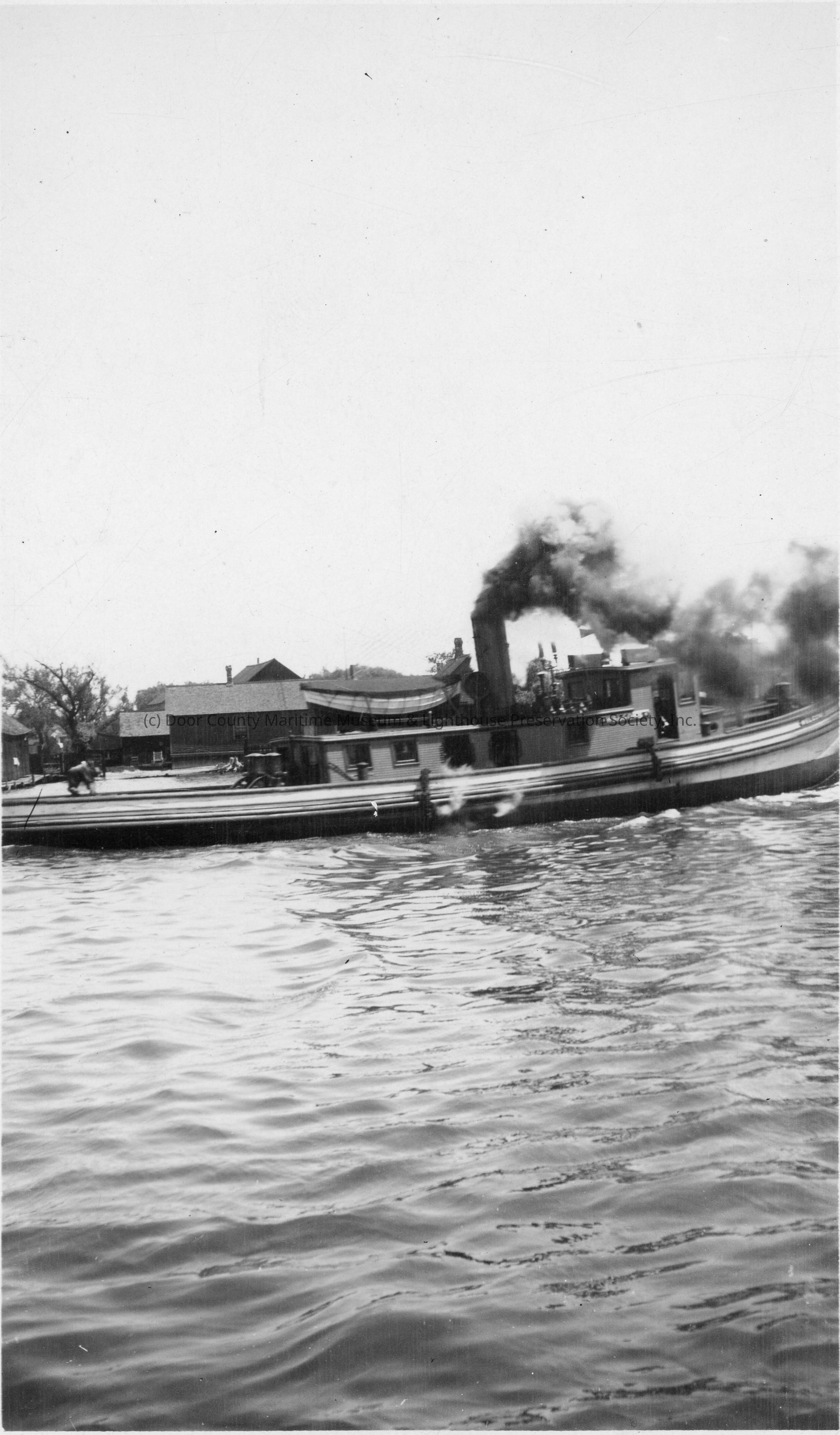 Tugboat Welcome with smoke coming out of stack