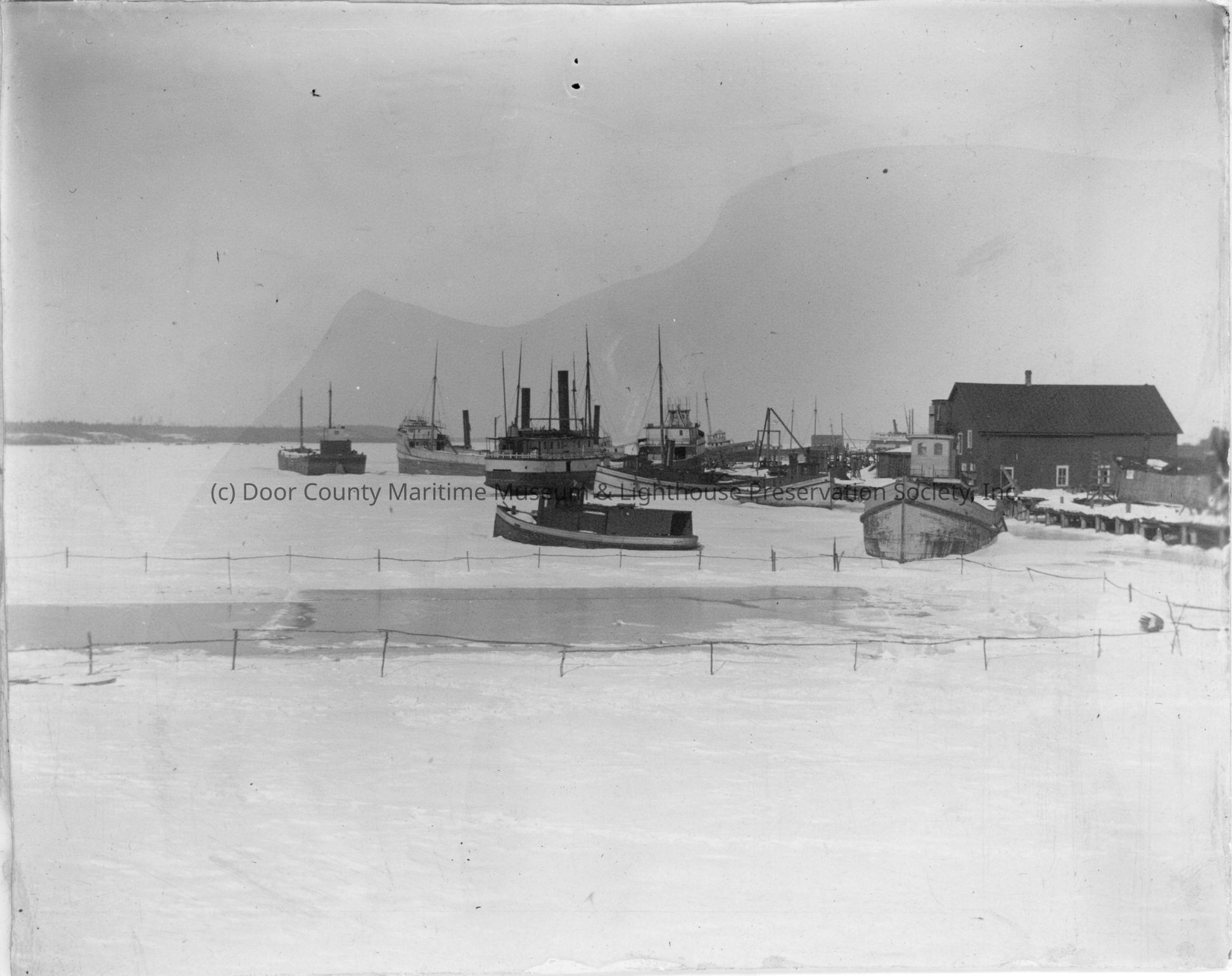 Tugboats and steamships in water during winter
