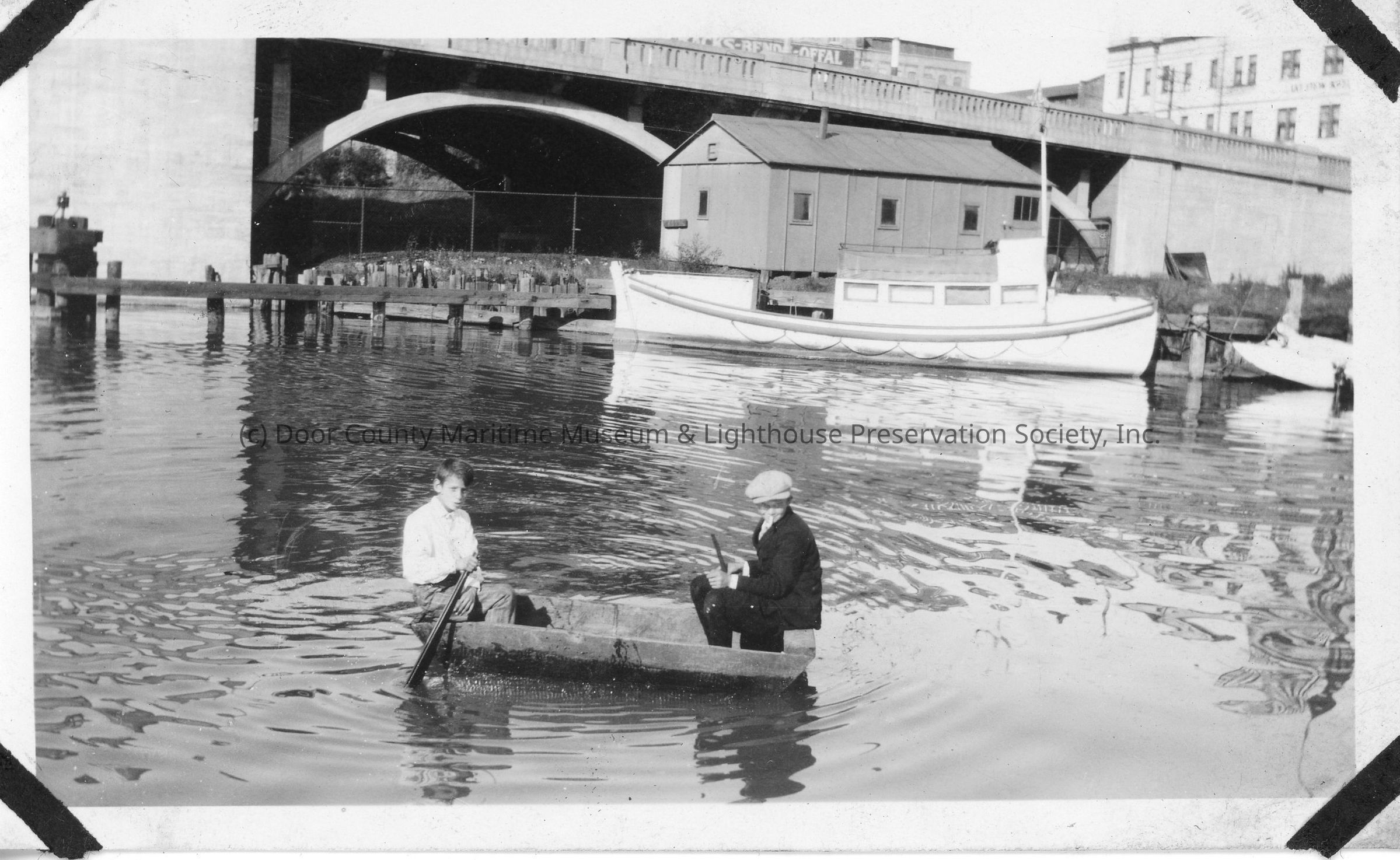Two children in wooden crate floating in river with boat docked in background