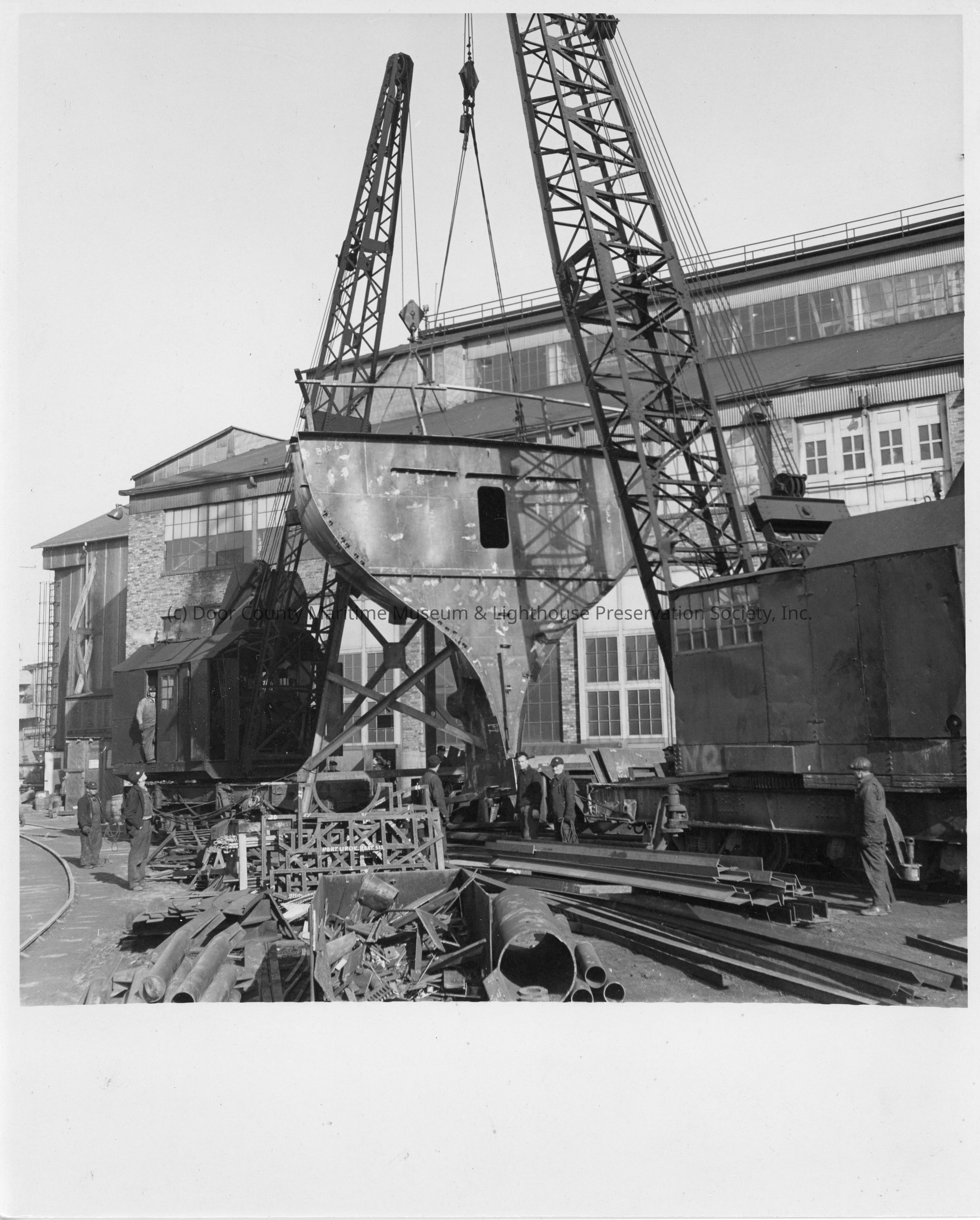 Two cranes suspending hull section