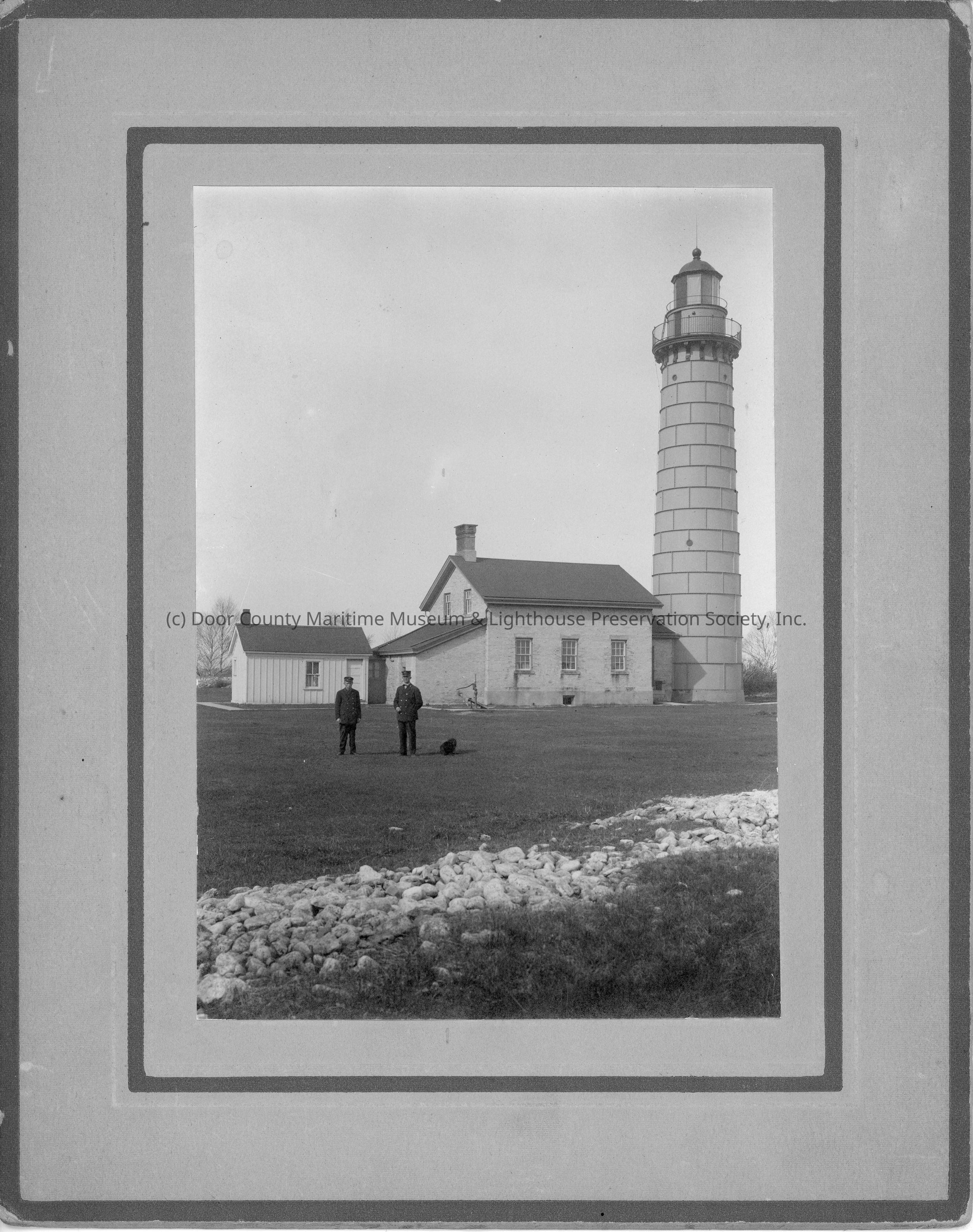 Two lighthouse keepers in front of Cana Island Lighthouse