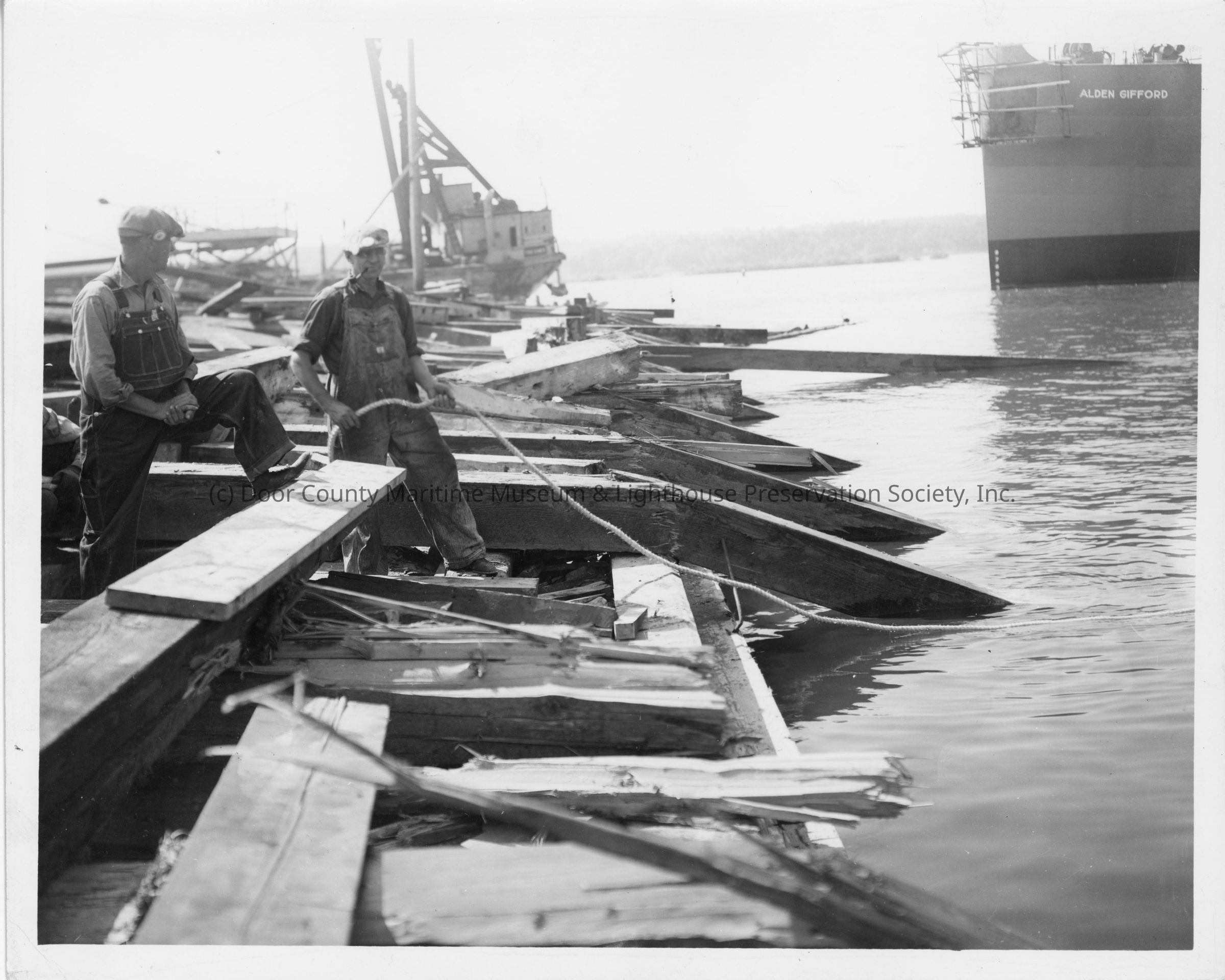 Two men cleaning up launch ways post-launch with Alden Gifford in background