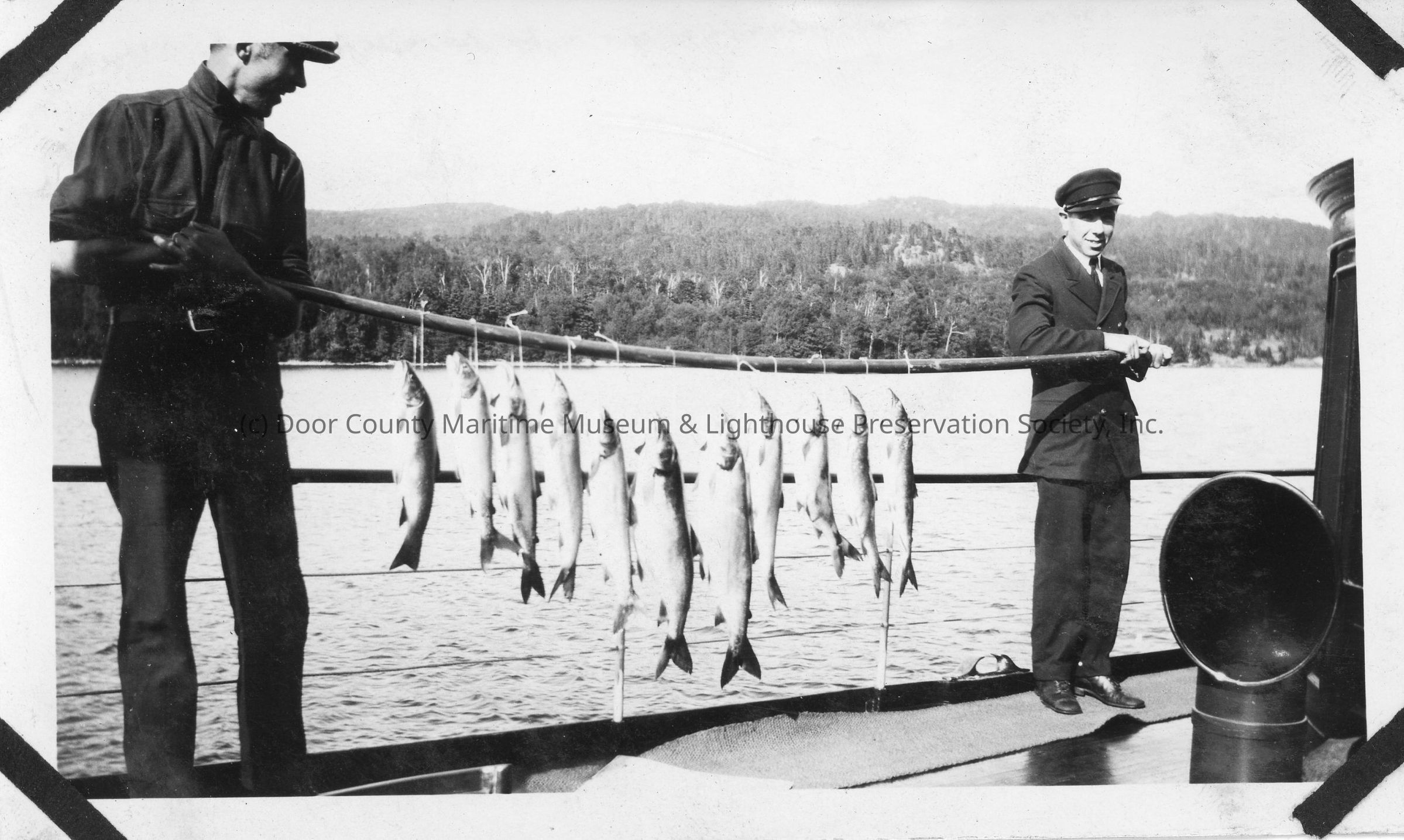 Two men holding 11 fish tied to pole