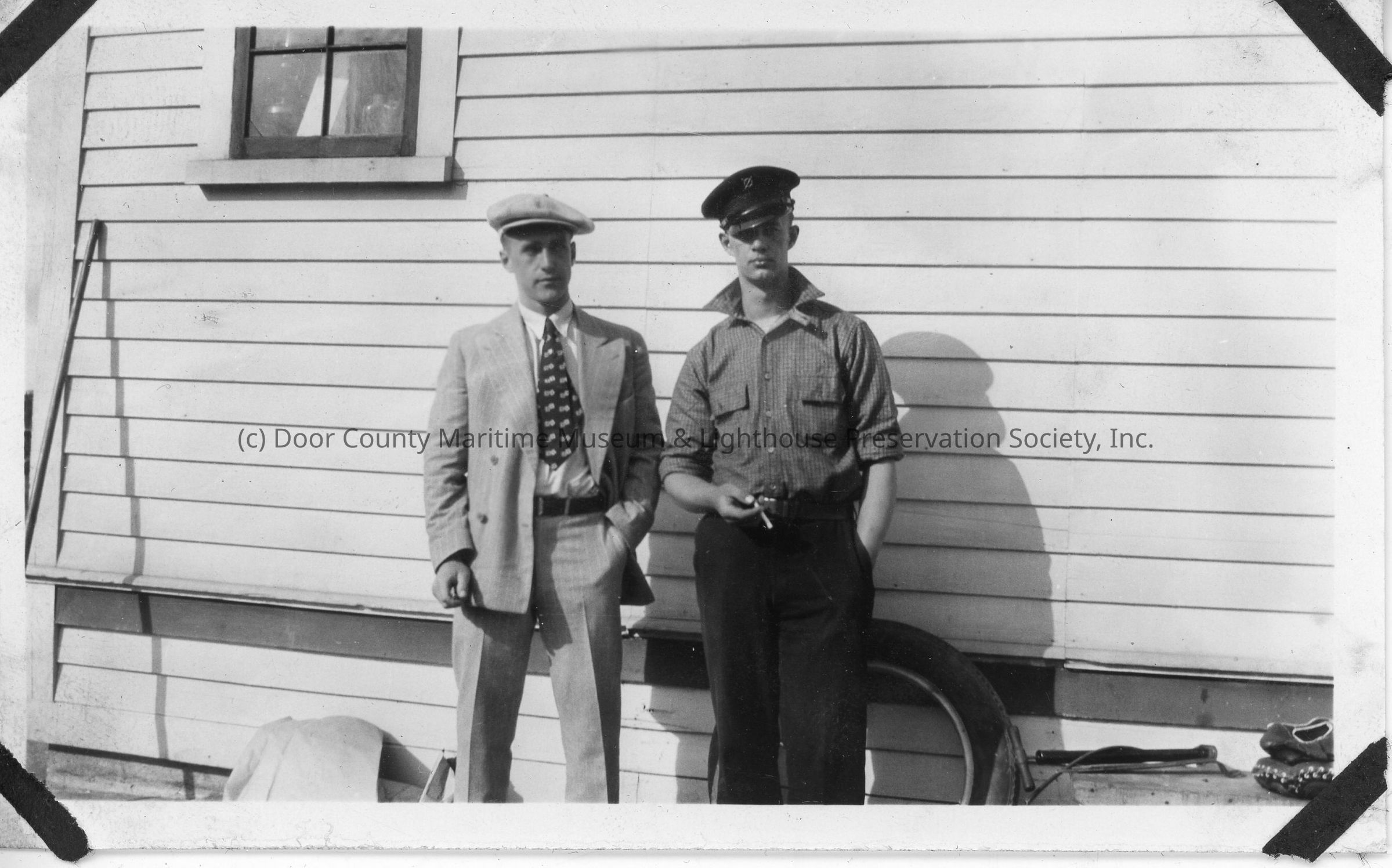 Two men in front of building one smoking