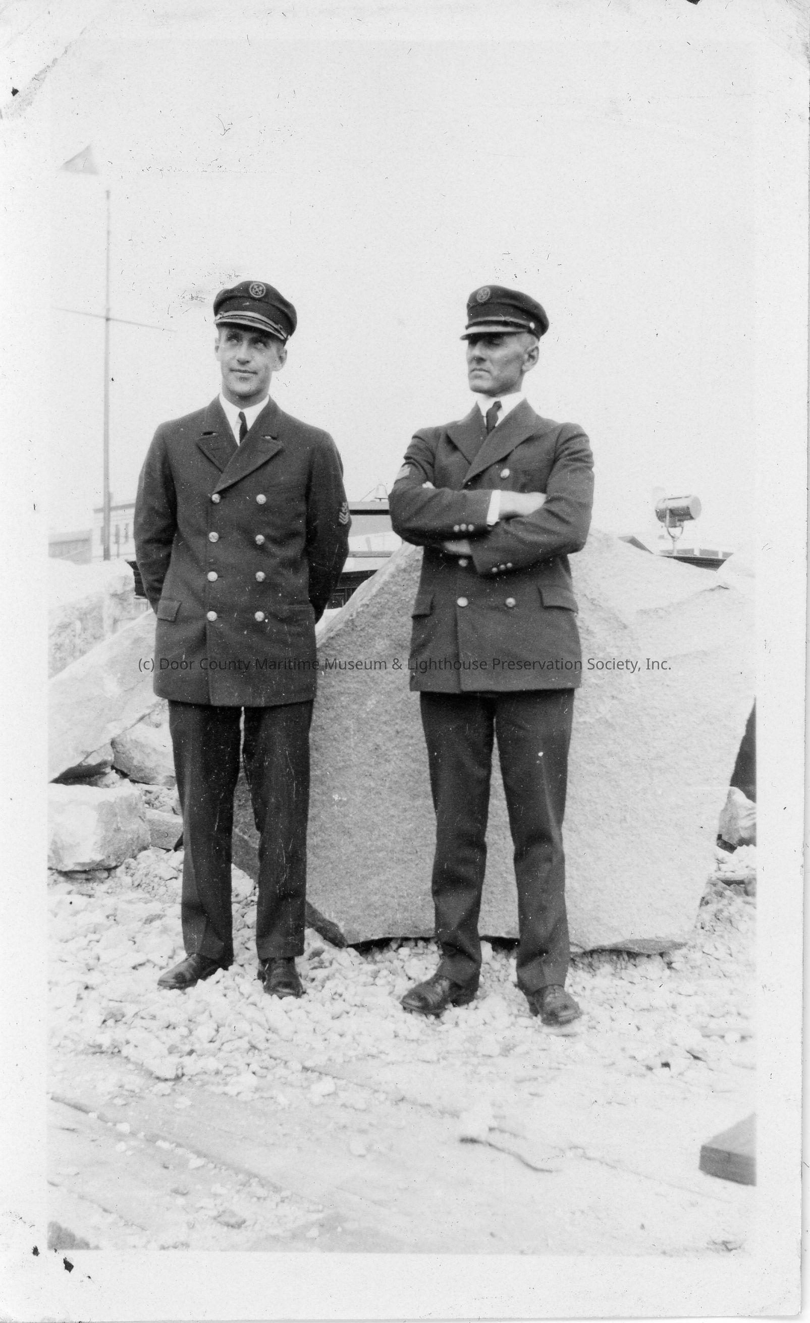 Two men in uniform standing in front of boulder