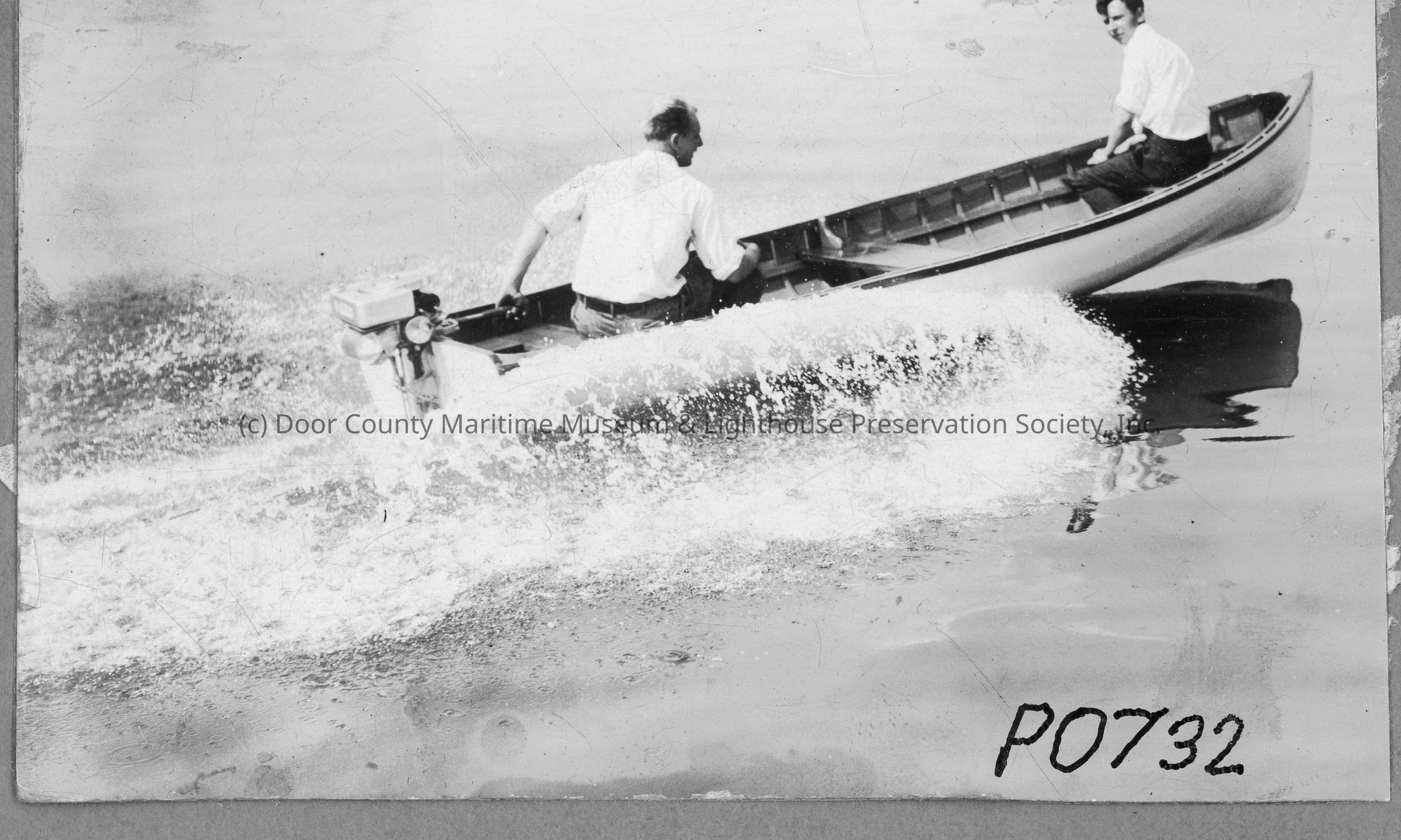 Two men on runabout underway with outboard motor runningEntry/Object ID