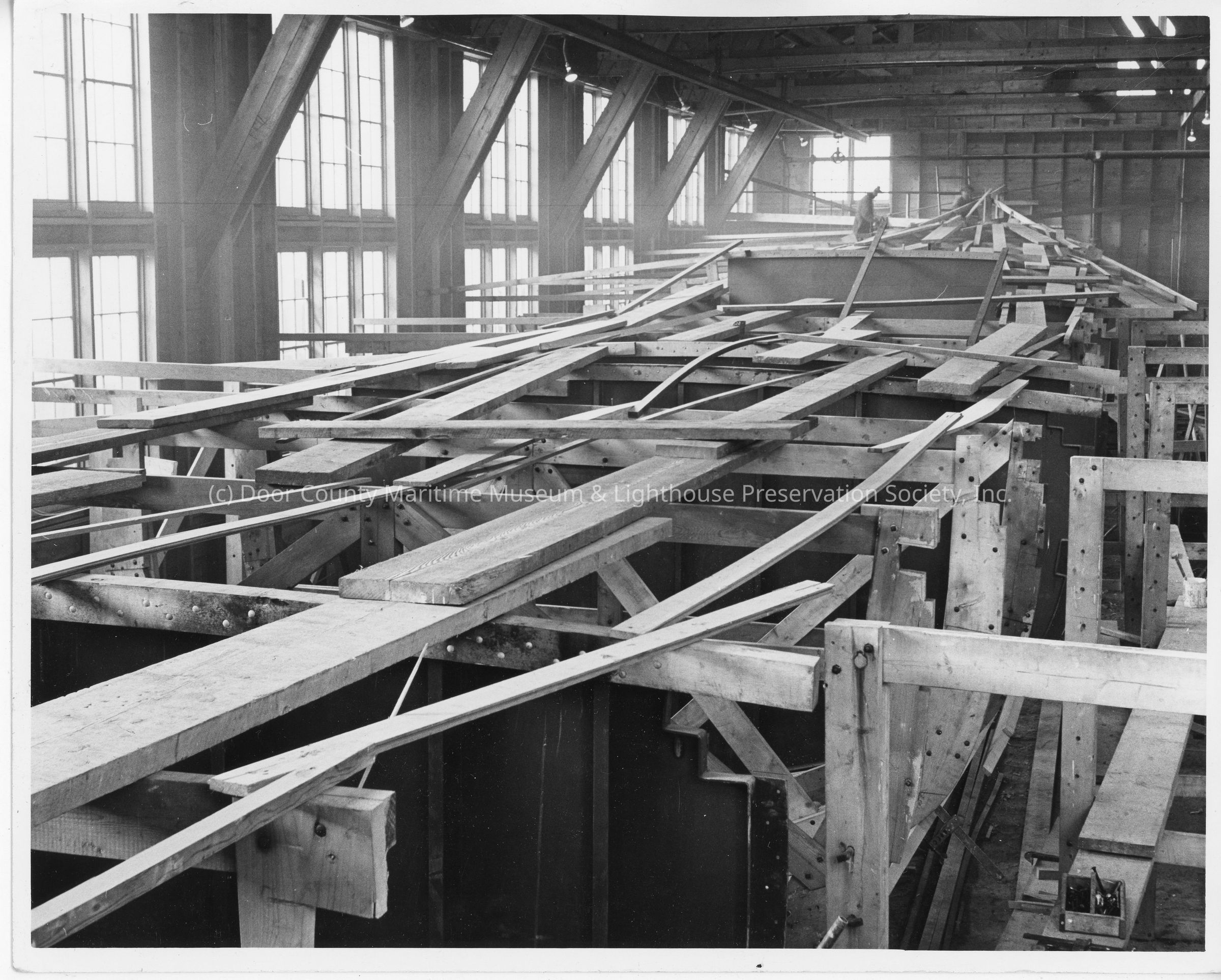 Two men sitting on frame of vessel at Peterson Boat Works December 4, 1941