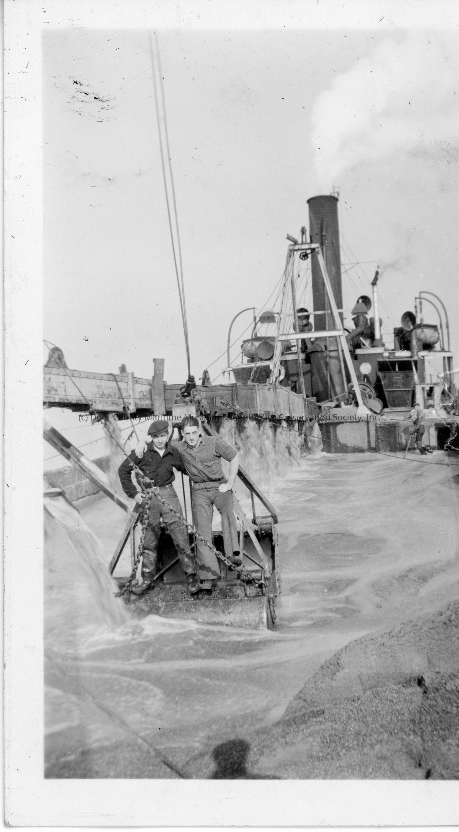 Two men standing on deck of freighter being doused in water