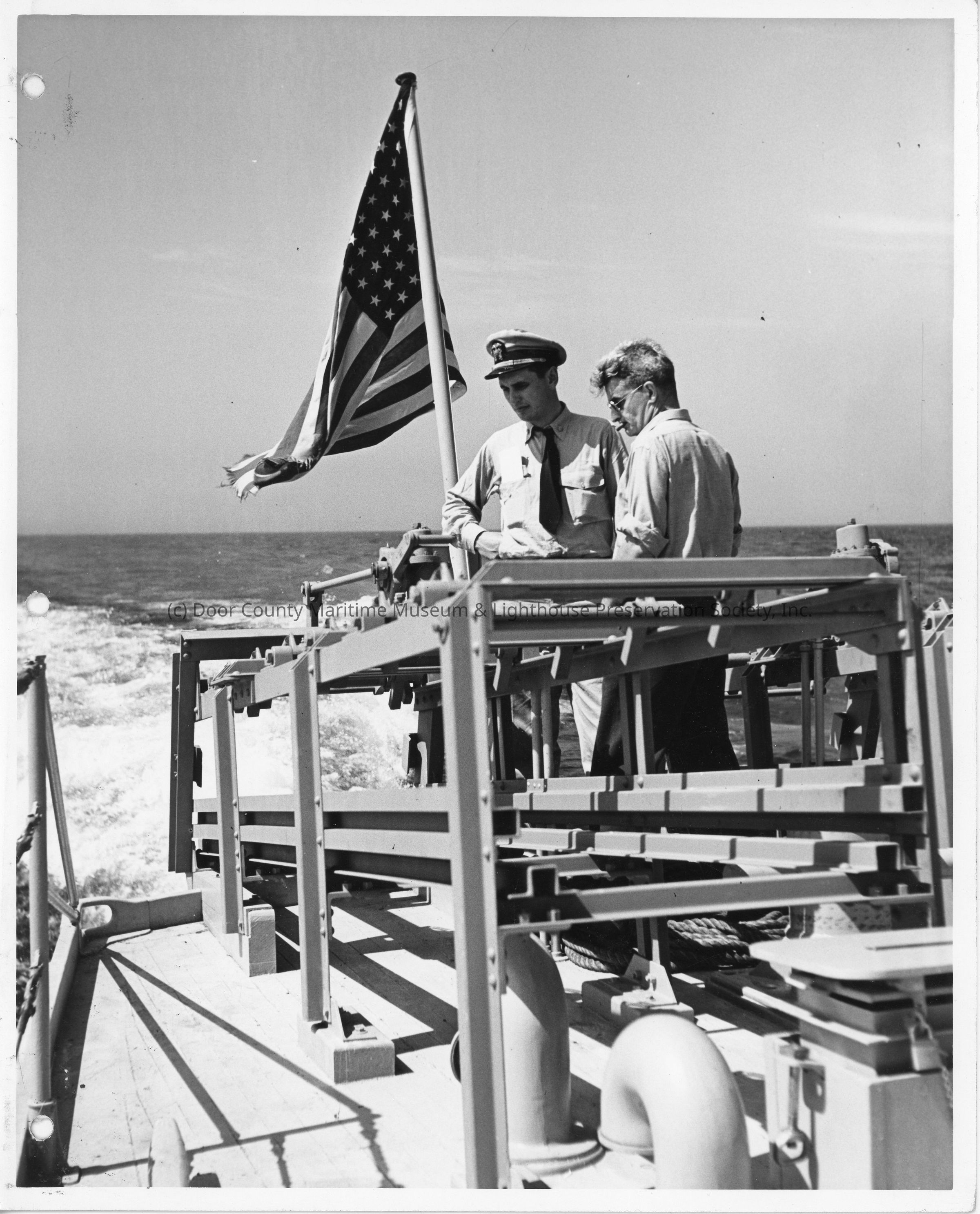 Two men standing on deck of SC-642 underway during sea trial July 18, 1942