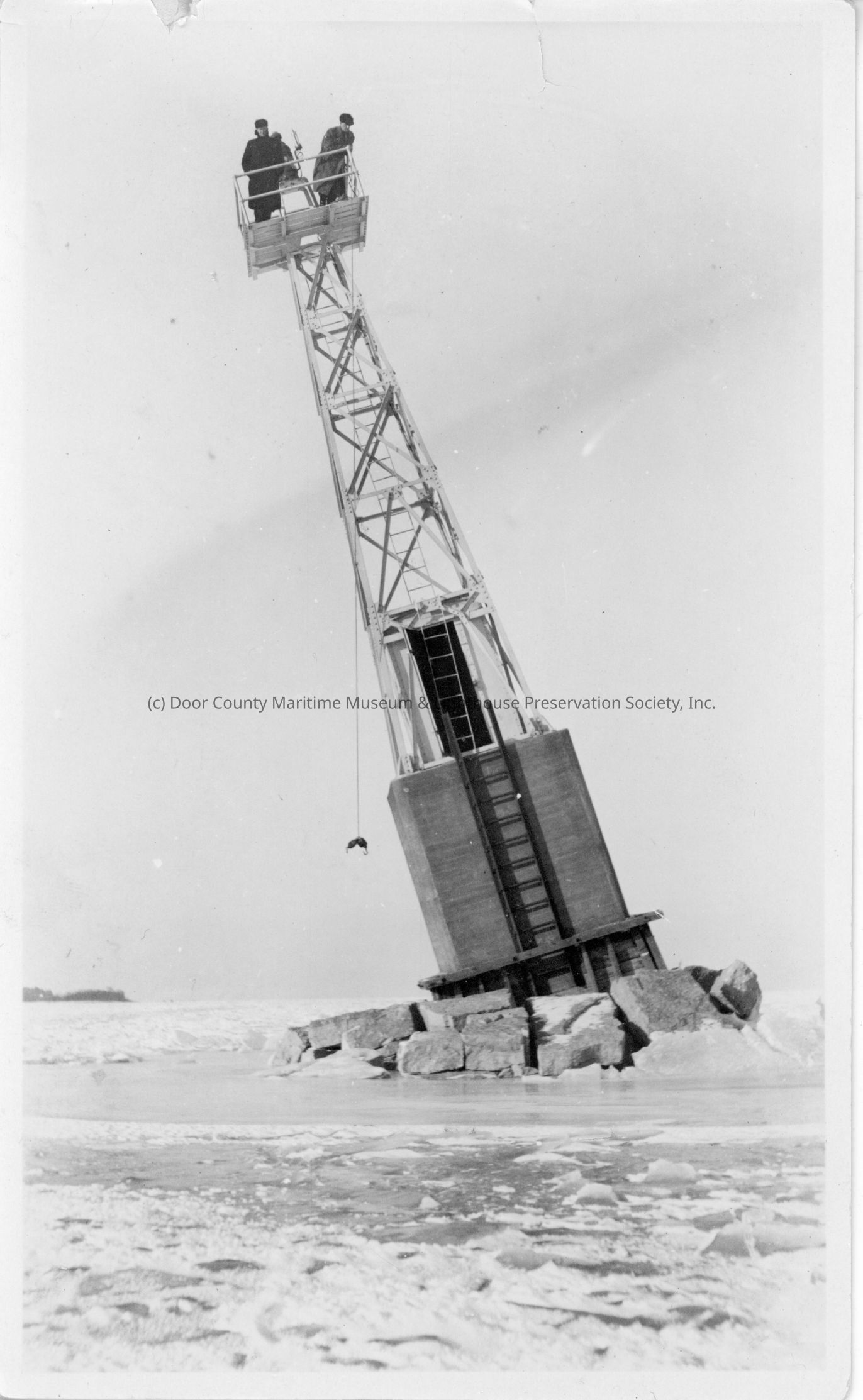 Two men standing on navigation light