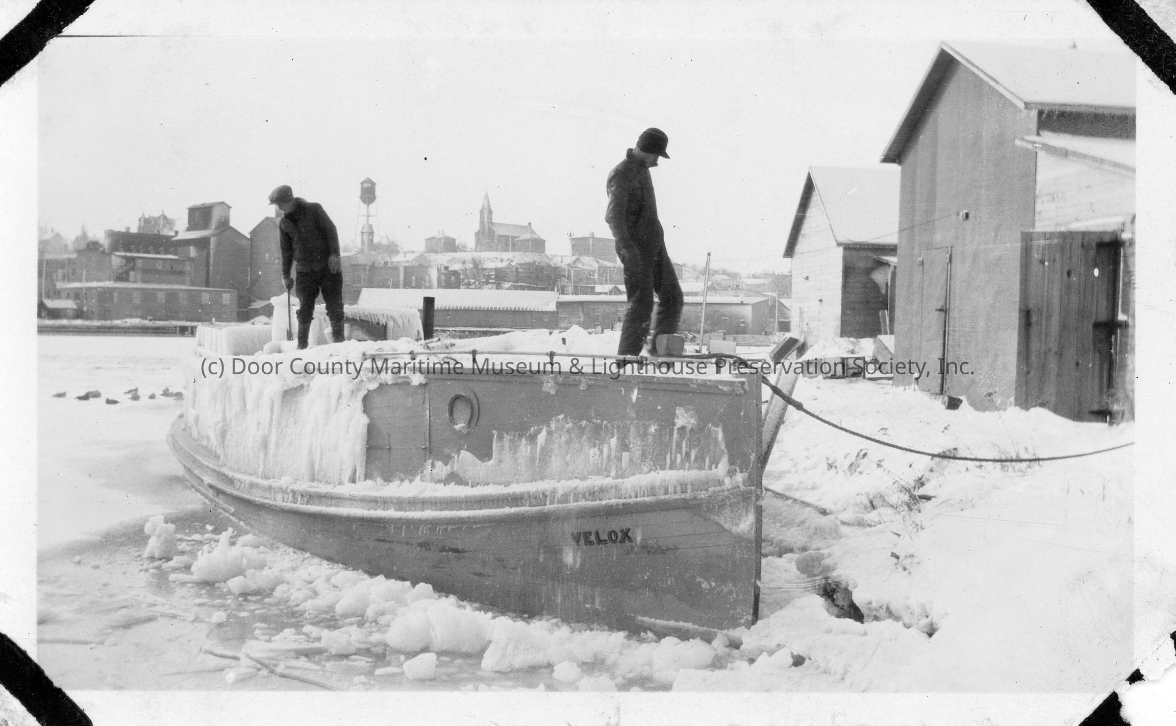 Two men standing on top of docked fishing tug Velox covered in ice