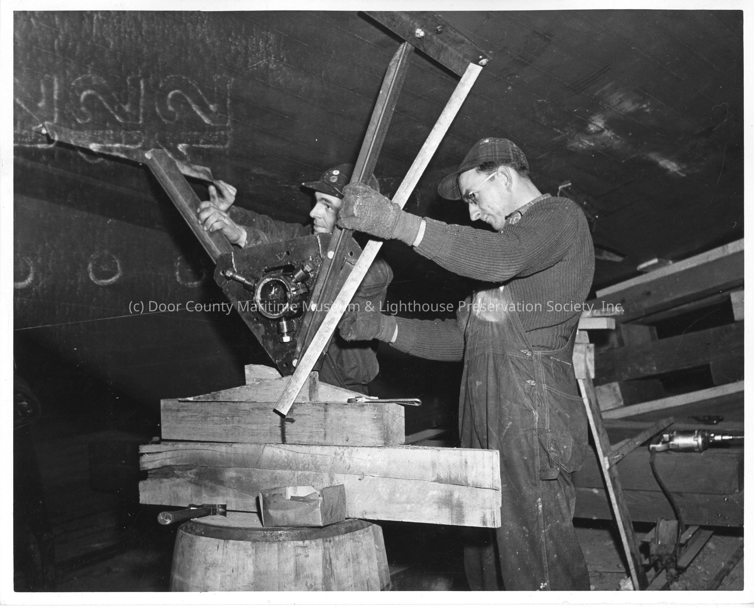 Two men working underneath vessel at Peterson Boat Works February 11, 1942