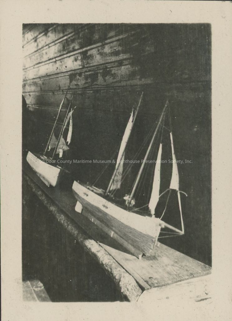 Two model sailboats rest on a bench. The Eri H. of Orham (or Orkam) and the Bascom of Fish Creek. 1919Location