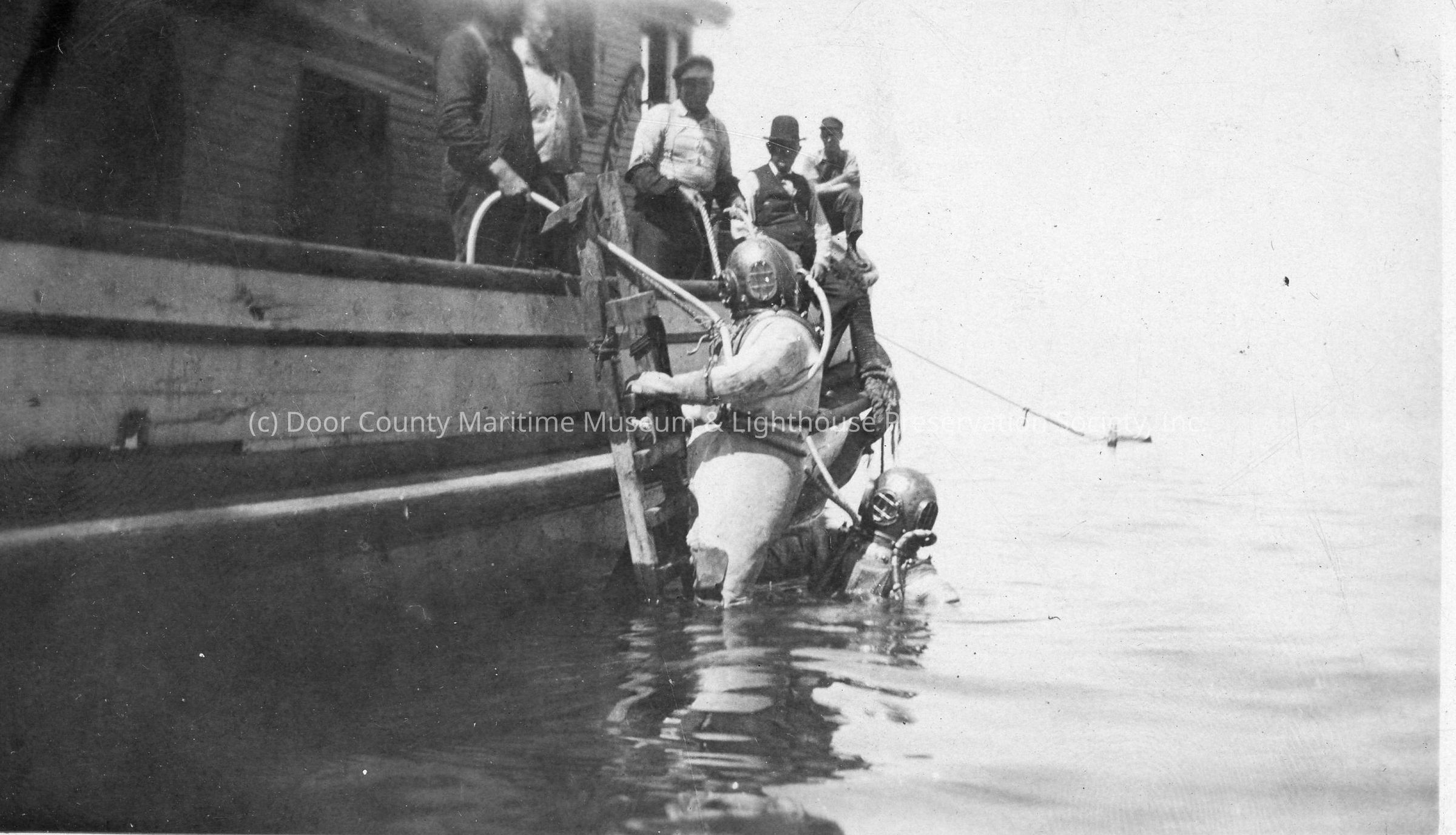 Two people in diving suits partially in water next to boat
