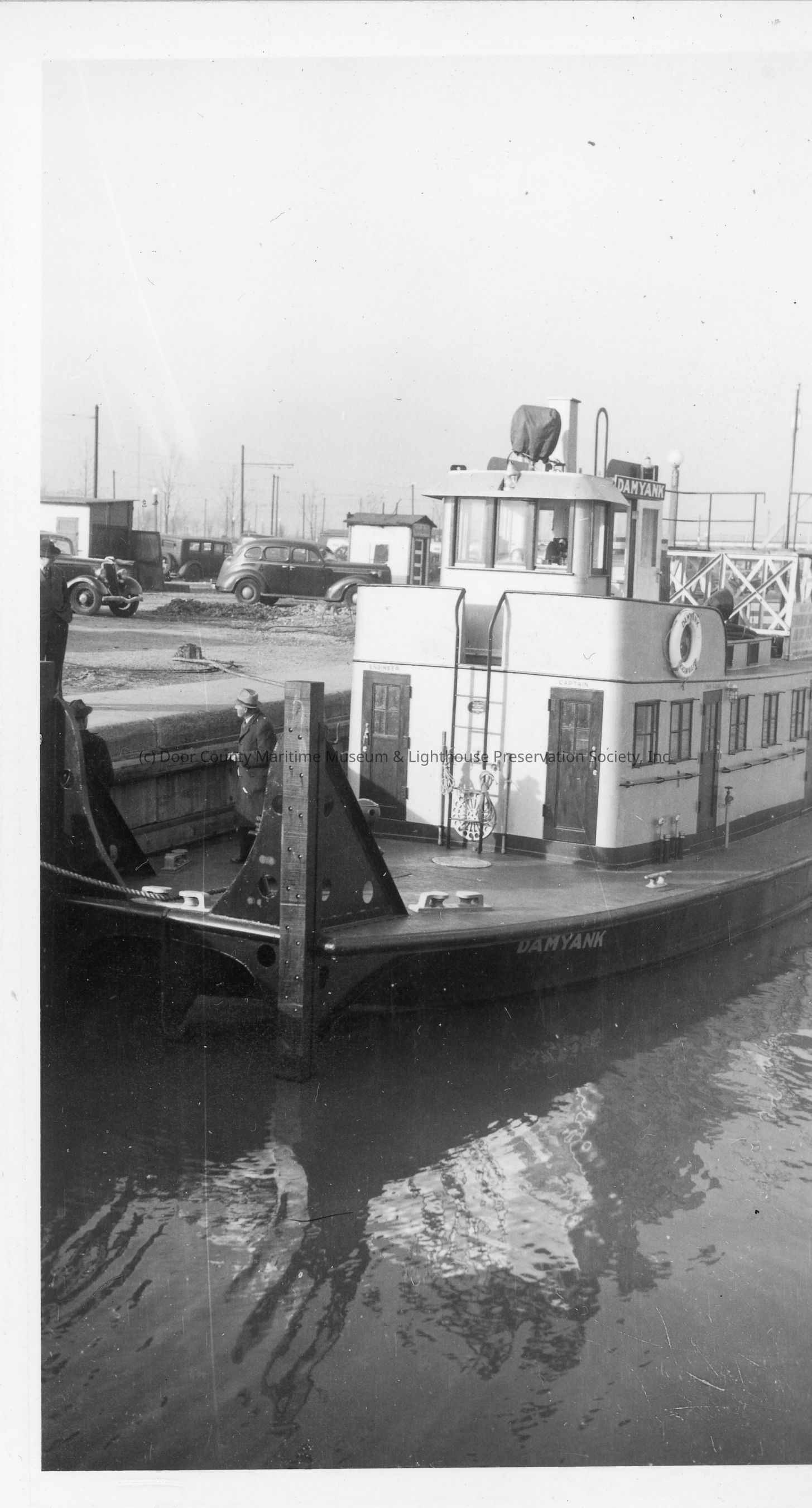 Two people standing on bow of push tug Damyank docked