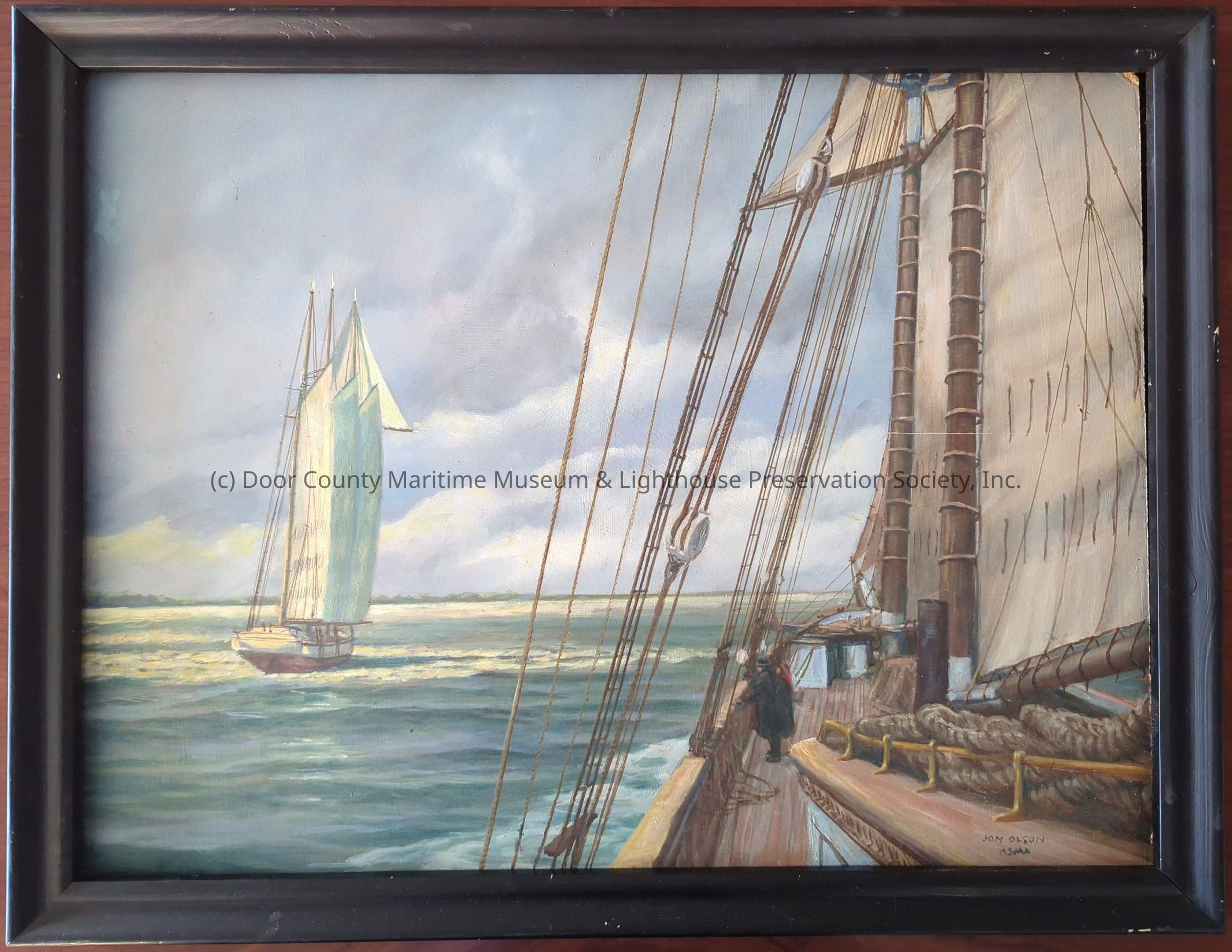 Oil Painting in black frame. Depicts two people on wooden schooner looking out to another wooden schooner