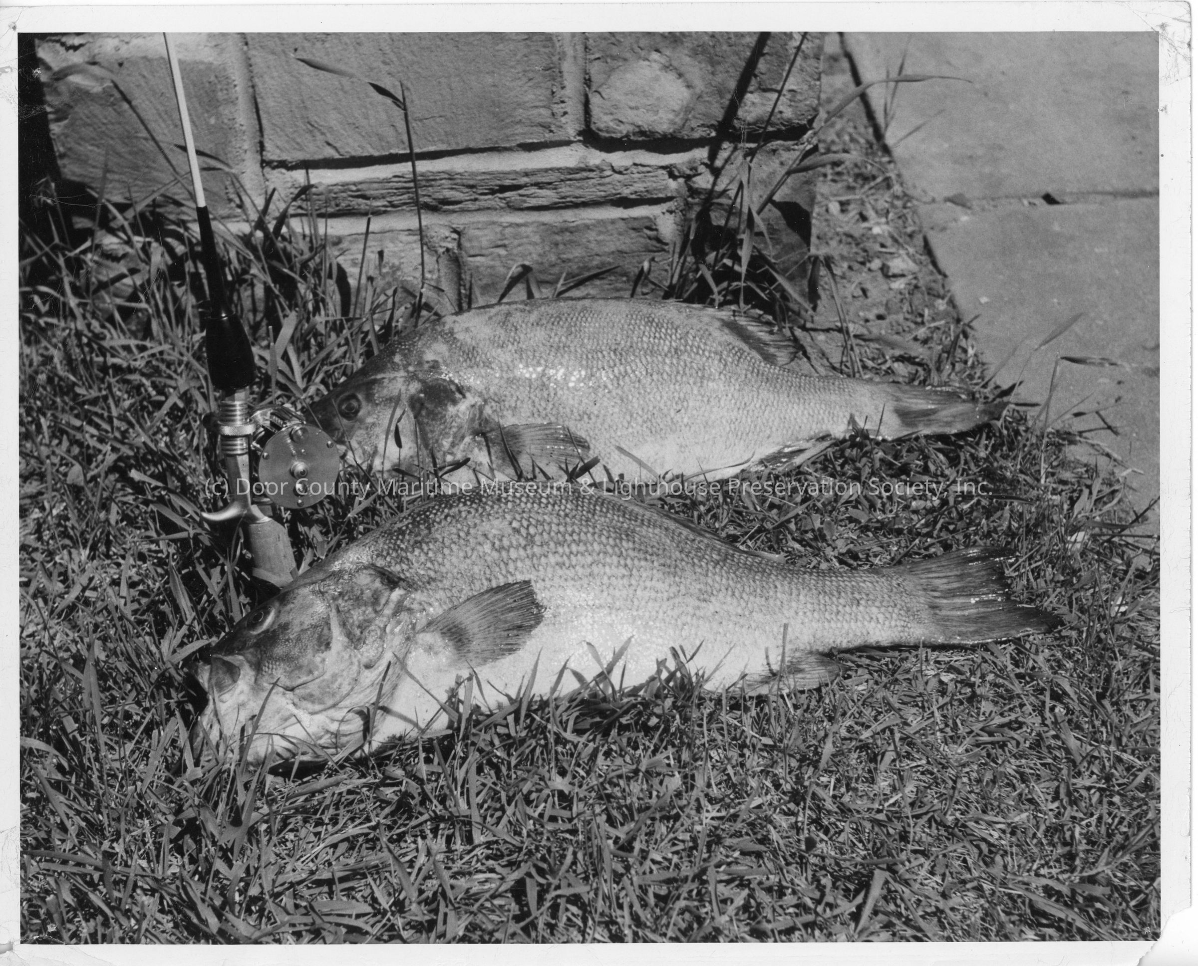Two small mouth black bass laying on grass with rod and reef June 20, 1947Entry/Object ID