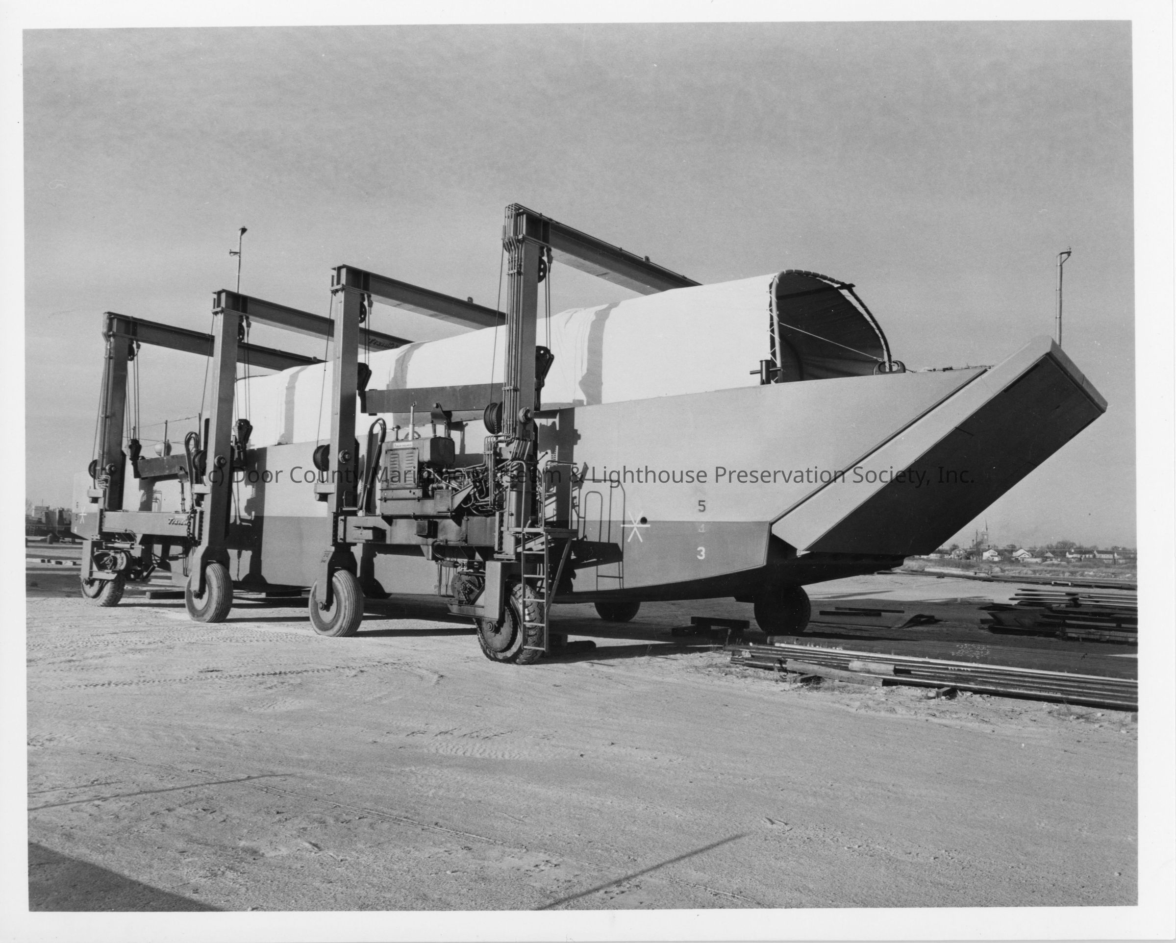 Two Travelifts holding landing craft