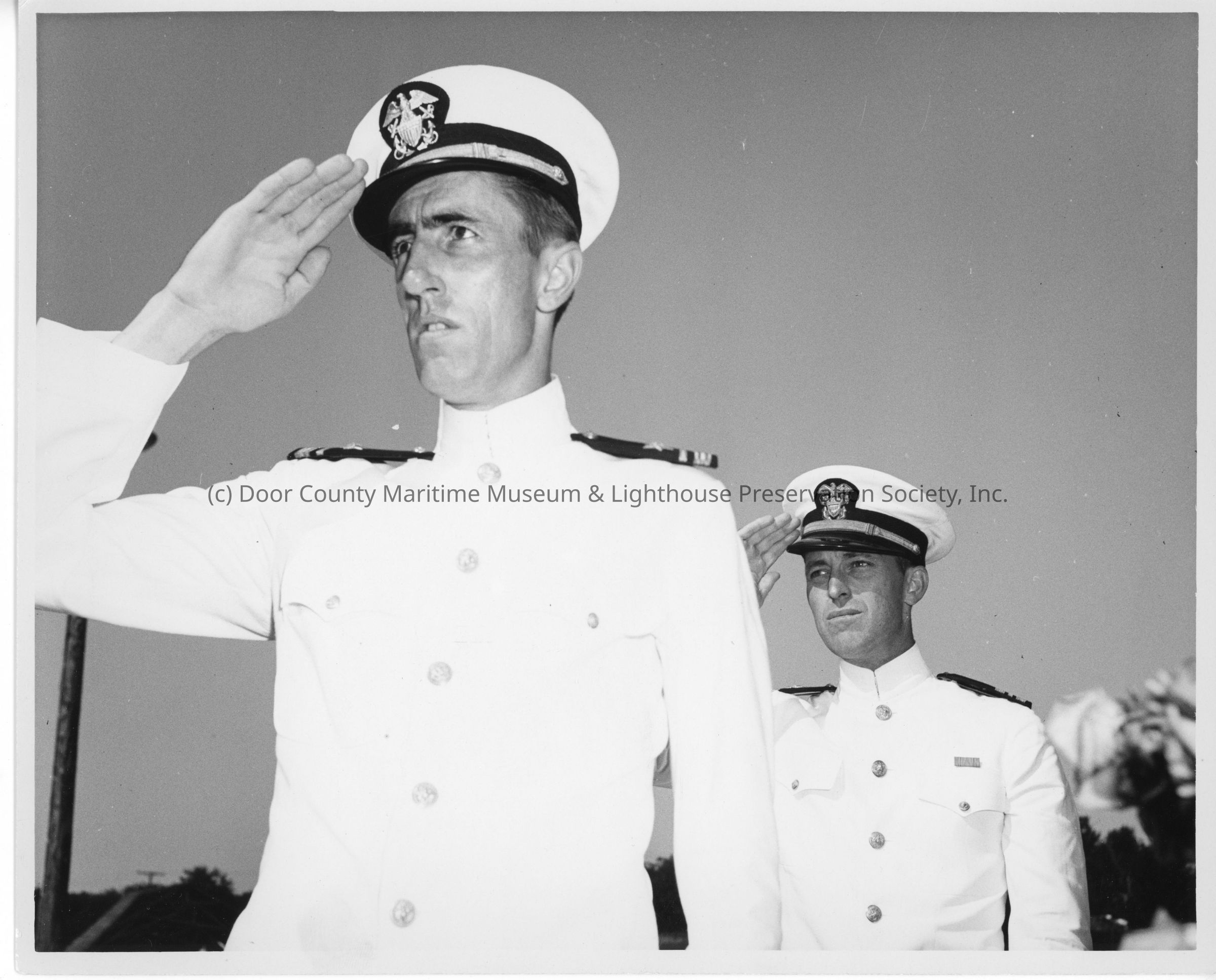 Two unidentified navy officers in dress uniforms salutingEntry/Object ID