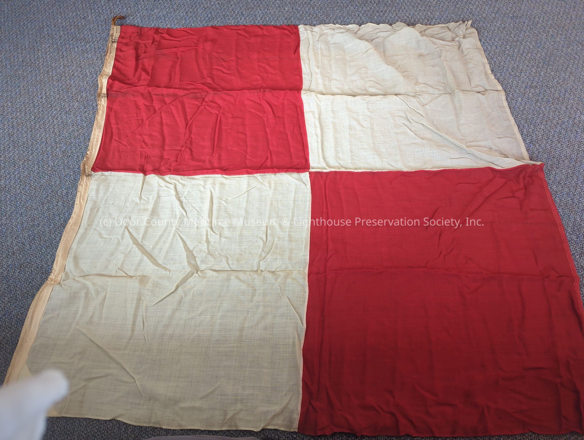 Signal flag: "U"; square; divided into four squares; red upper left square; white upper right square; white bottom left square; red bottom right square; dirty.Location