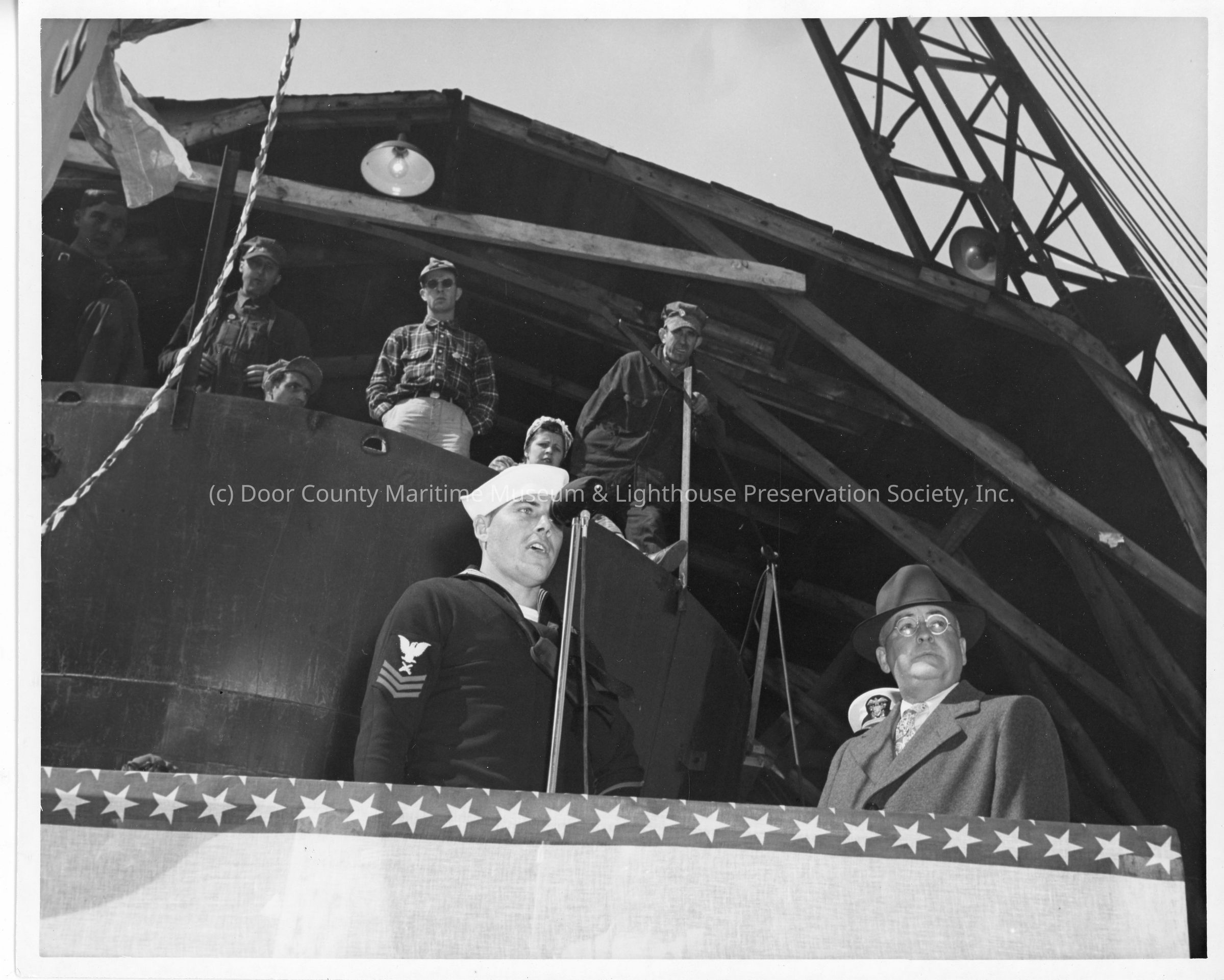 Unidentified navy man at microphone alongside Leathem D. SmithEntry/Object ID