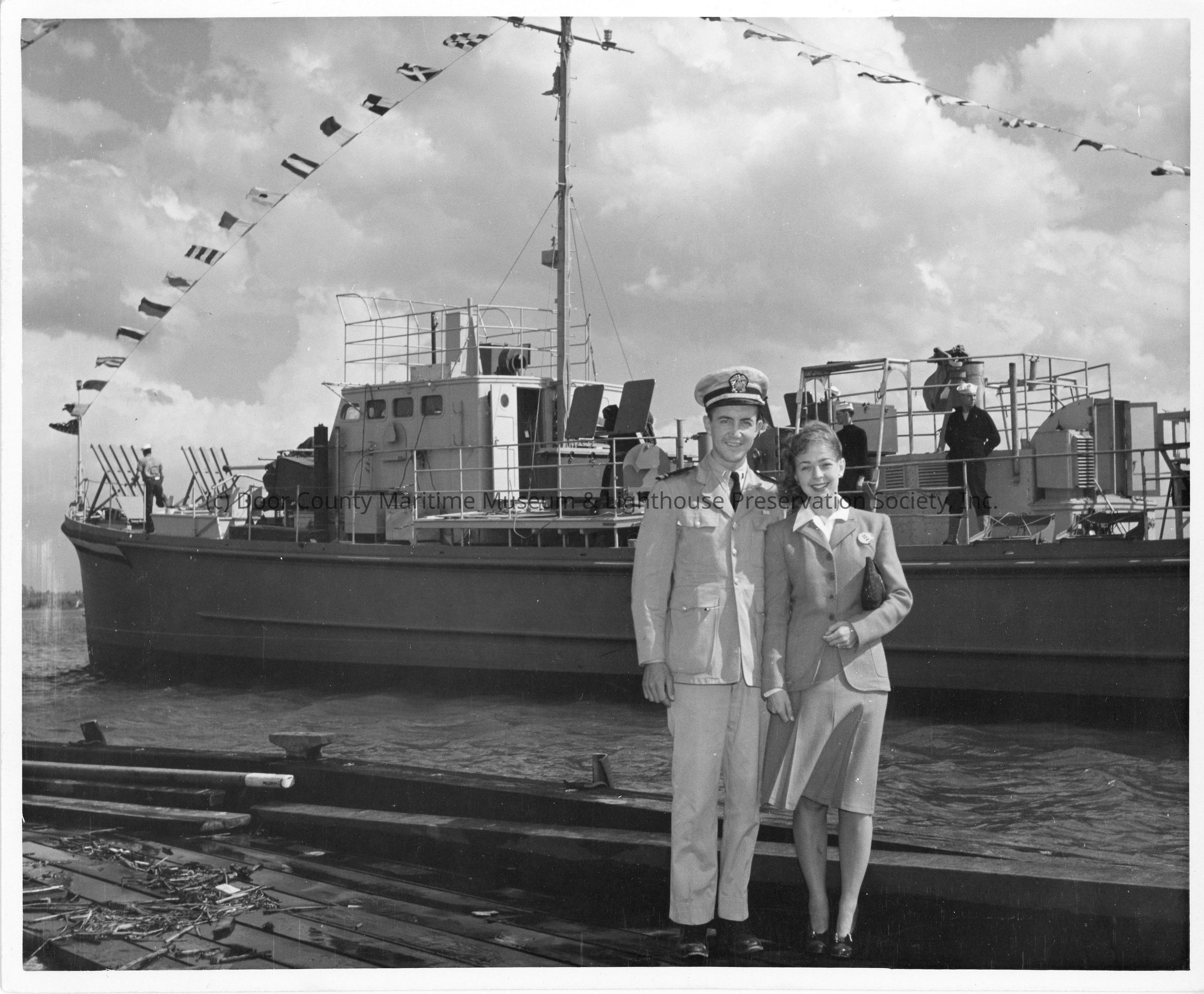 Unknown naval officer and woman in front of vessel