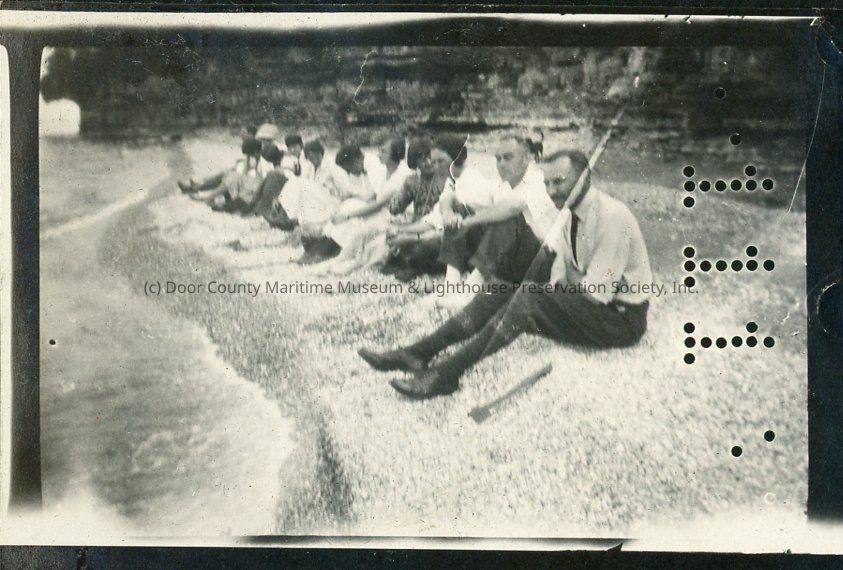 A group of men and women are seated on a gravel shoreline. Identified in the Hotz album as "Up at the 'Door' near Europe Lake. August 1923.Location